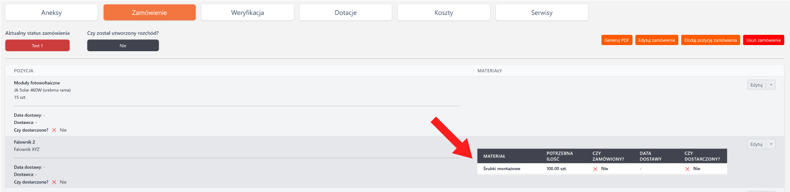 Możliwe jest przejście do szczegółów zamównienia, aby przypisać więcej materiałów, edytować bądź usunąć zamówienie.