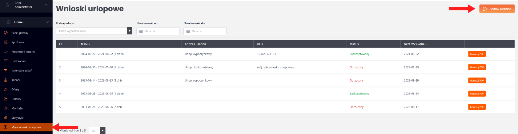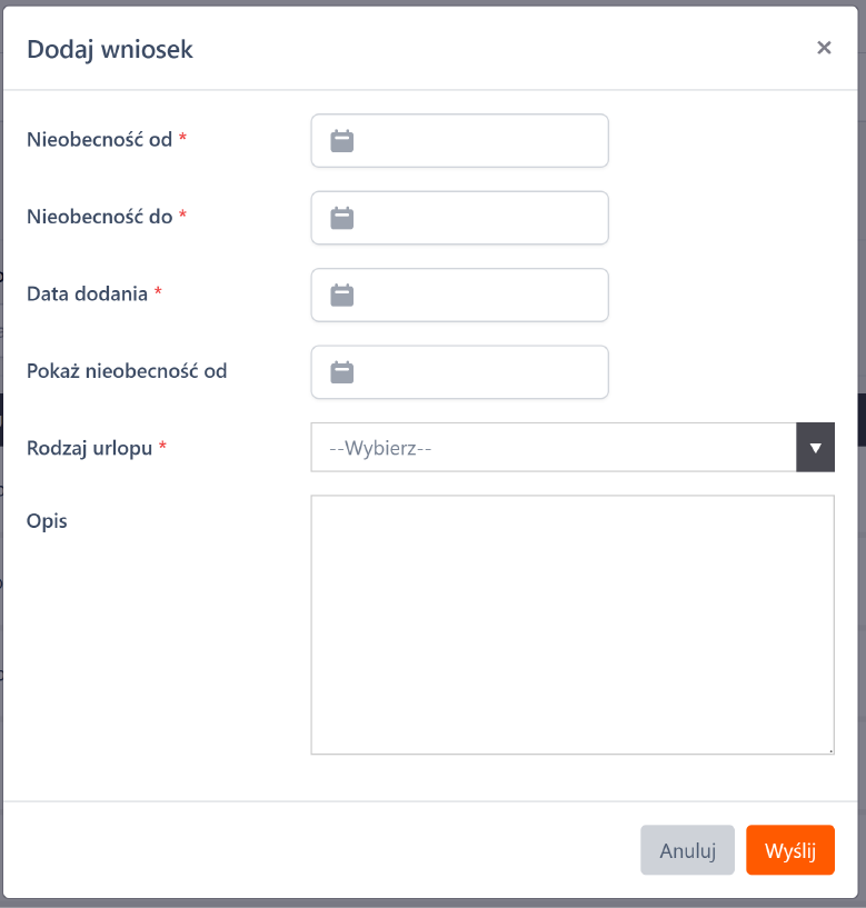 Użytkownik może określić datę rozpoczęcia i zakończenia urlopu, datę dodania, pokaż nieobecność od, wybrać rodzaj urlopu oraz dodać ewentualne uwagi w postaci notatki. Istotną funkcjonalnością jest możliwość generowania wniosku w formie pliku PDF.