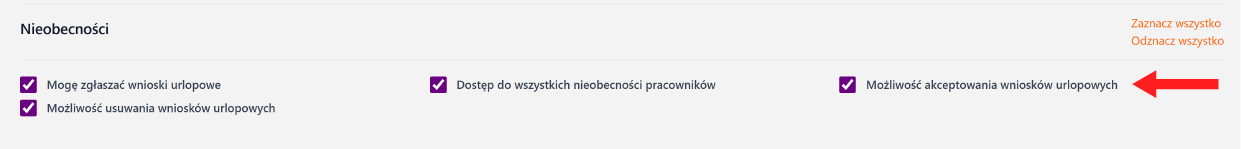 W celu zapewnienia płynności procesu akceptacji wniosków urlopowych, moduł umożliwia określenie osób odpowiedzialnych za akceptację wniosków poprzez nadanie im uprawnienia "Możliwość akceptowania wniosków urlopowych".
