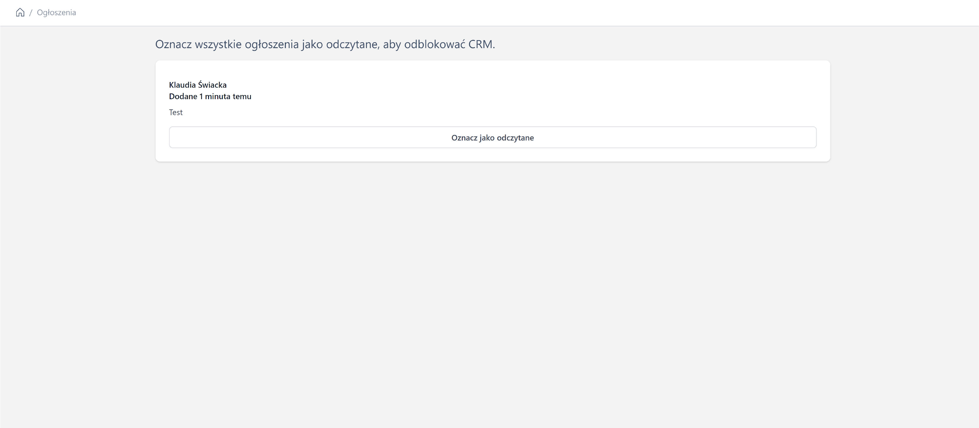 - Zablokowania CRM do odczytania ogłoszenia: Wstrzymanie dostępu do systemu do momentu odczytania ogłoszenia.