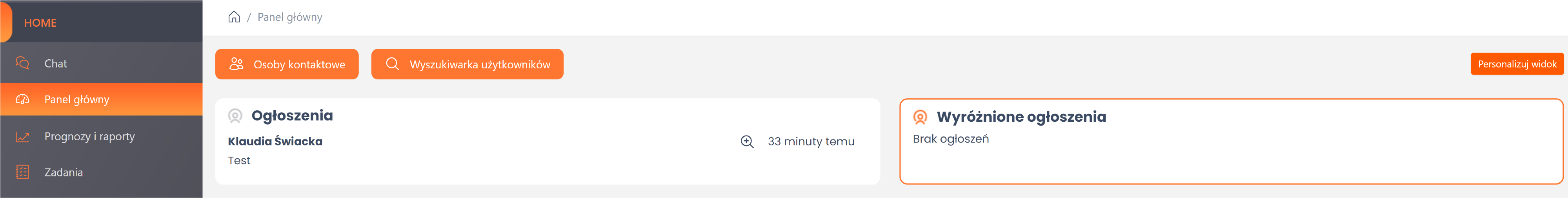 Moduł "Ogłoszenia" nie ogranicza się jedynie do dedykowanej zakładki. Na panelu głównym dostępne są dwa użyteczne widżety: