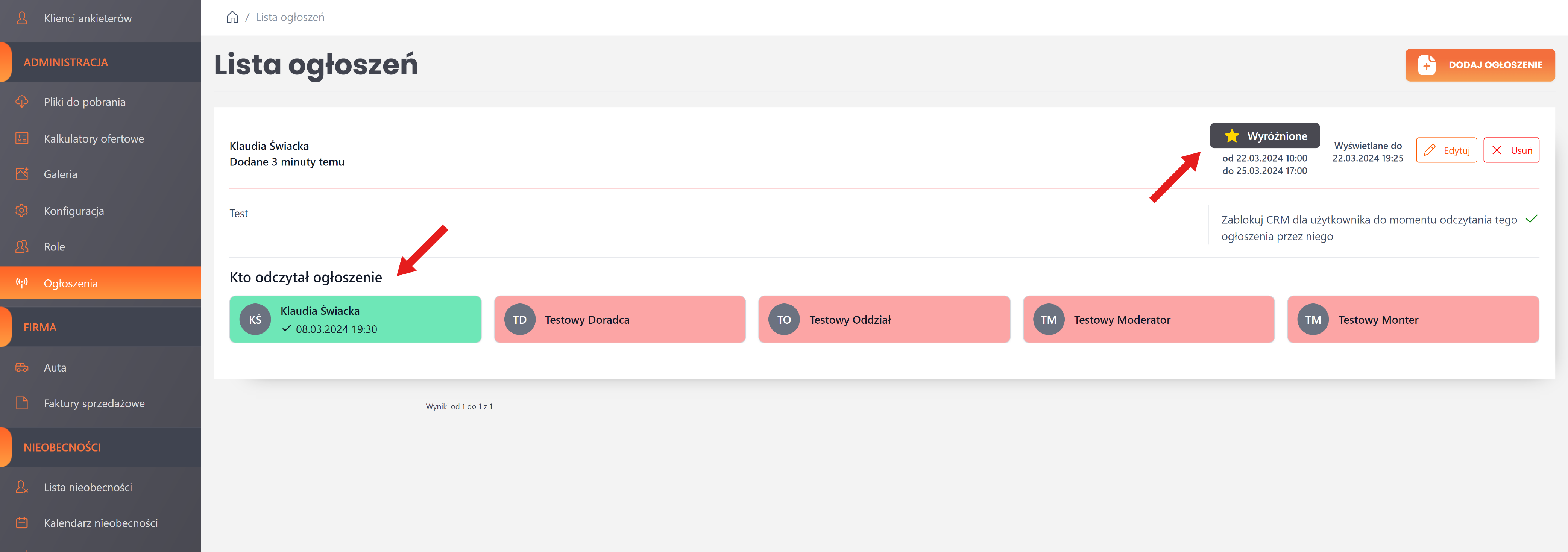 W zakładce "Ogłoszenia" użytkownicy mają pełen wgląd w wszystkie ogłoszenia przypisane do nich. Mogą sprawdzić, kto odczytał dane ogłoszenie, oraz czy jest ono wyróżnione do określonej daty.