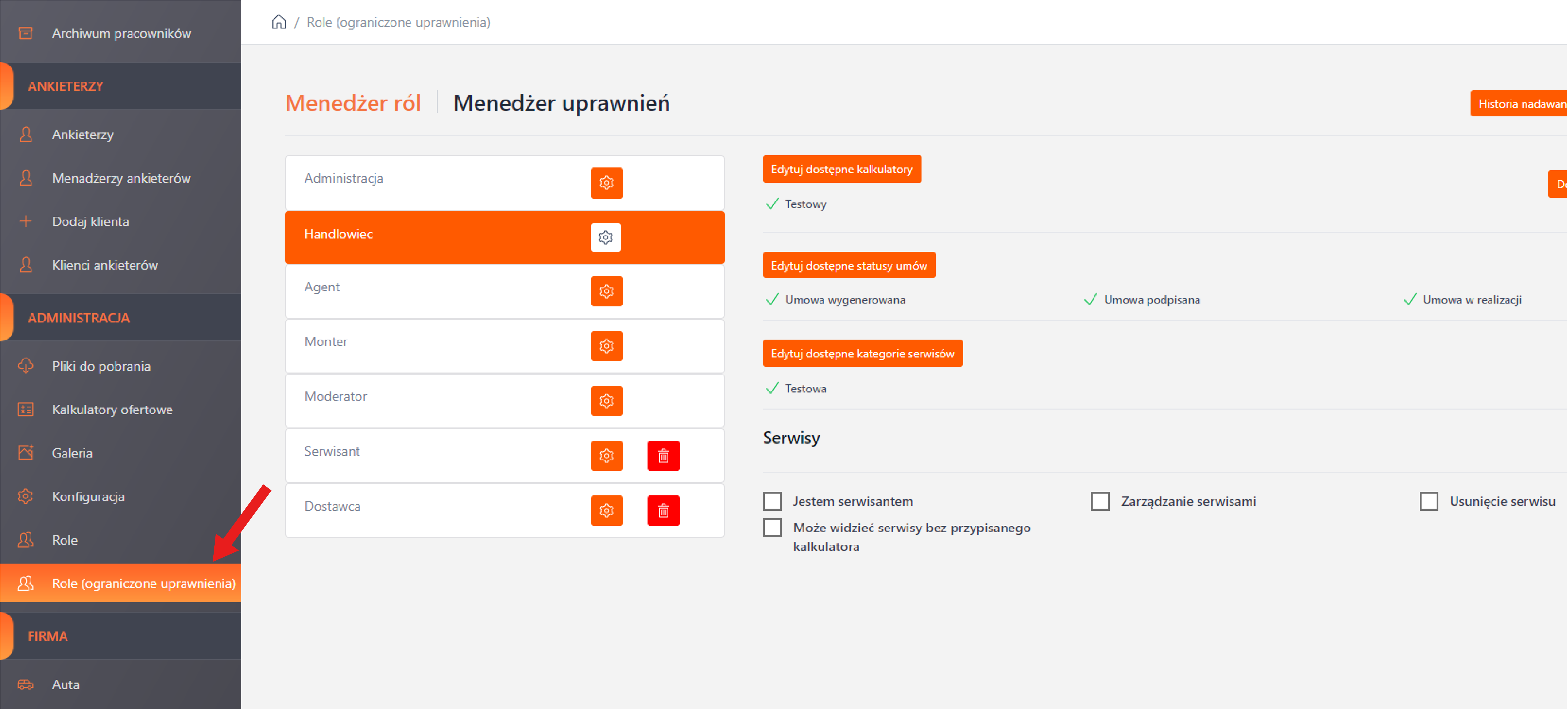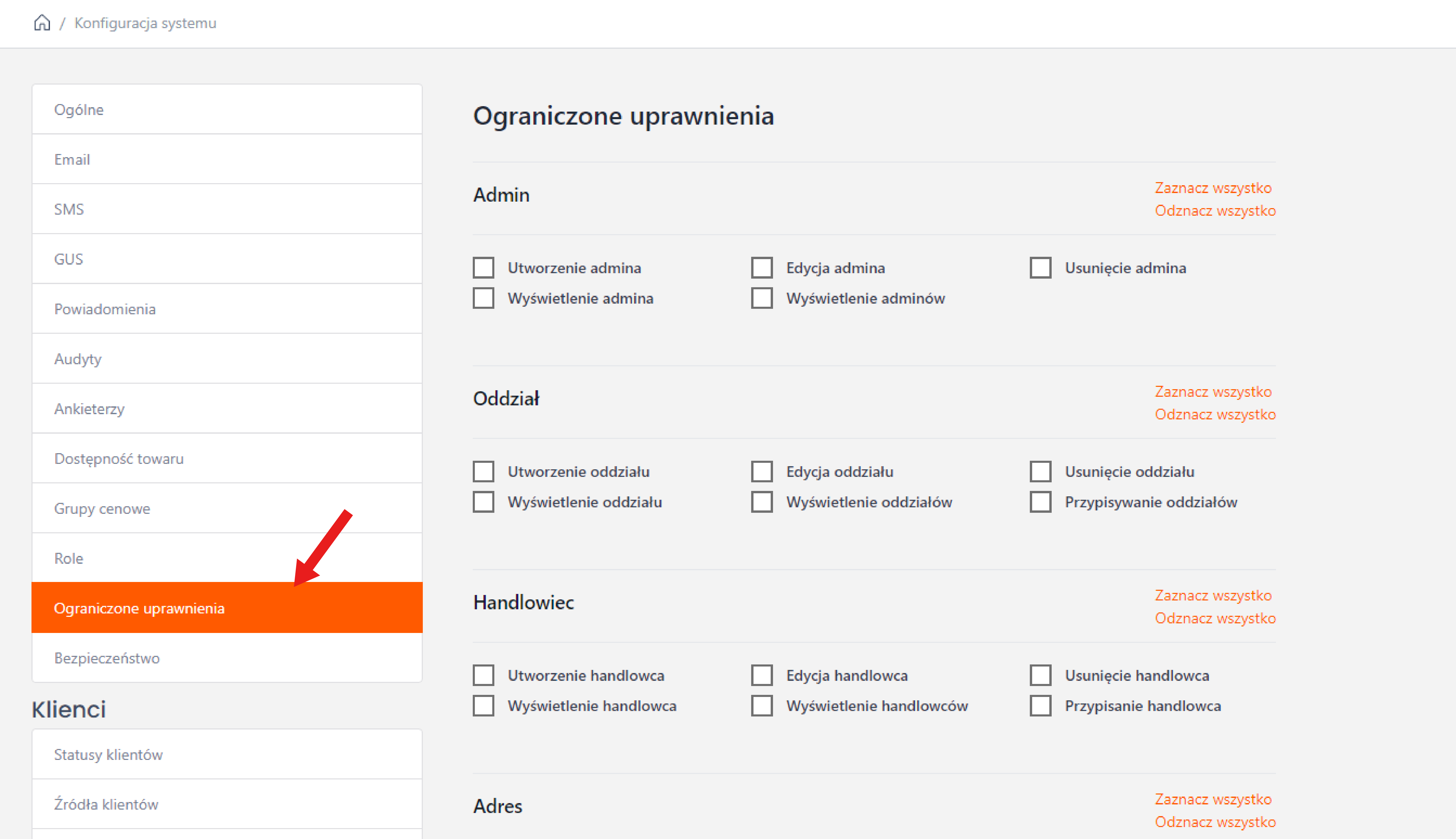 Aby skorzystać z modułu "Ograniczone Zarządzanie Rolami", administrator systemu CRM musi przejść do zakładki Konfiguracja, a następnie wybrać opcję "Ograniczone uprawnienia". W pierwszej kolejności administrator wybiera, jakie konkretne uprawnienia będą mogły być ustawione przez osoby trzecie.