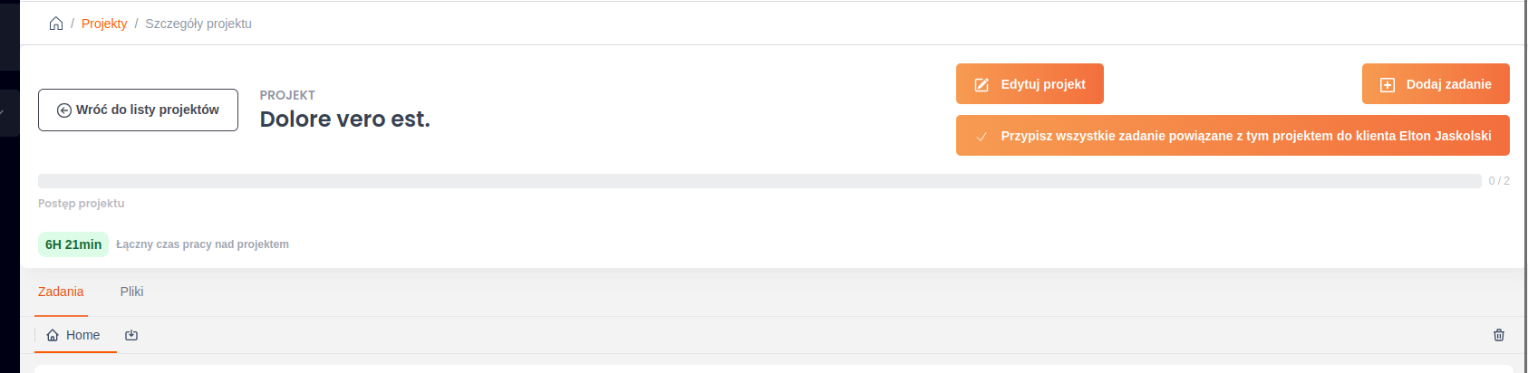 W szczegółach projektu użytkownik ma możliwość dodania nowego zadania, edycji projektu oraz wyboru istniejącego zadania z listy. Ta funkcjonalność pozwala na elastyczne zarządzanie projektem, umożliwiając dodawanie nowych zadań w trakcie jego realizacji, dokonywanie ewentualnych zmian w projekcie oraz szybkie przejście do istniejących zadań w celu ich edycji lub aktualizacji.