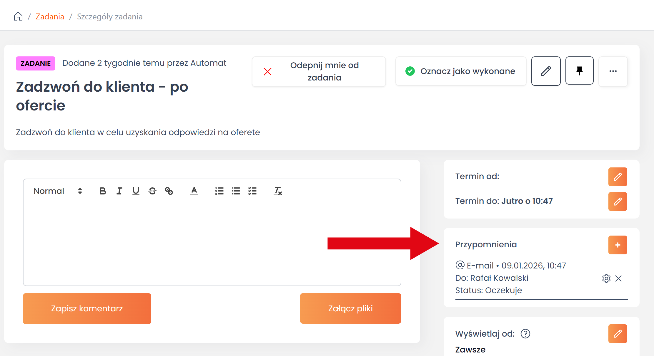 Jest to funkcjonalność szczególnie przydatna w pracy operacyjnej, projektowej oraz w obsłudze klientów wymagających regularnego kontaktu i przypomnień.