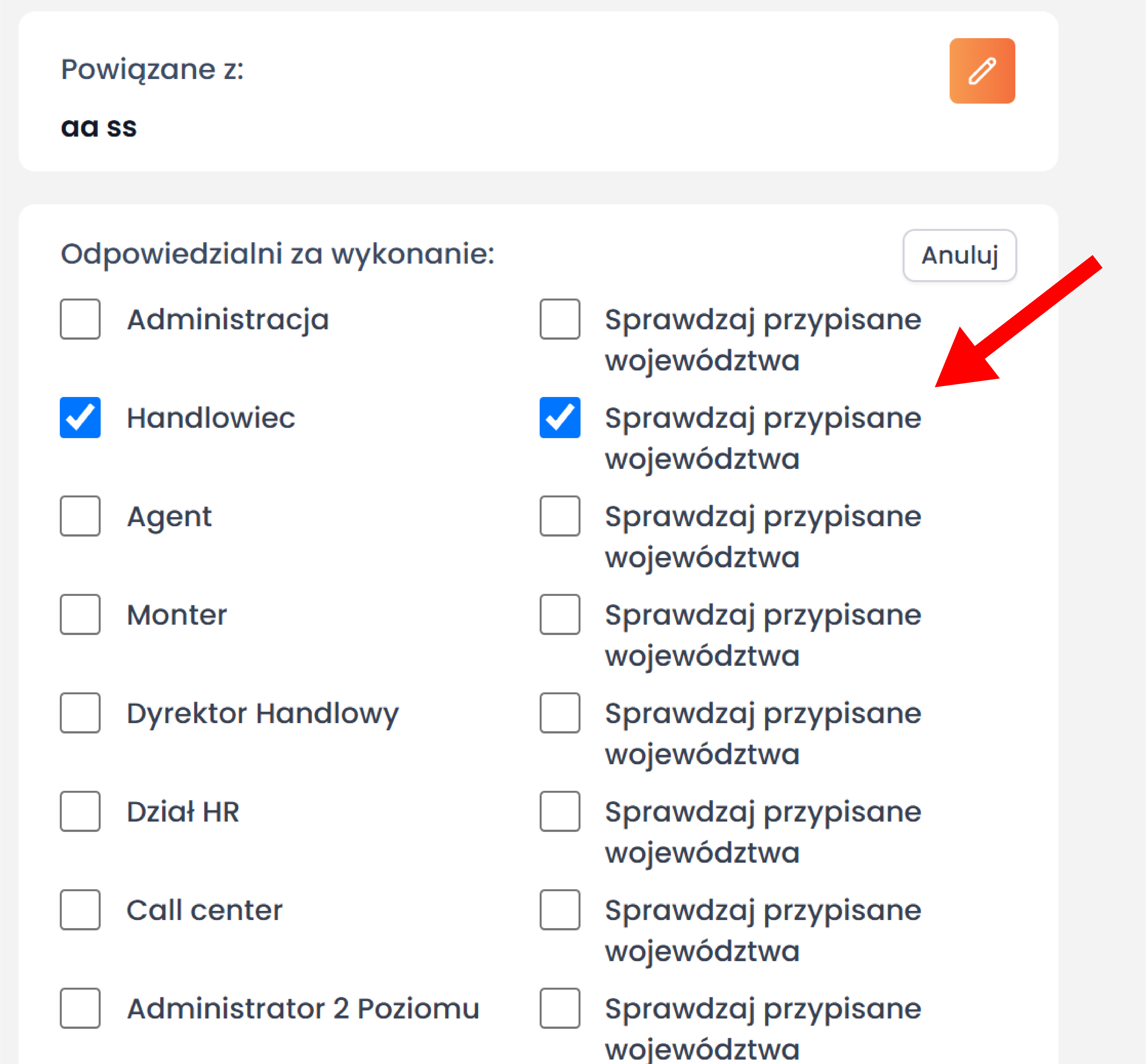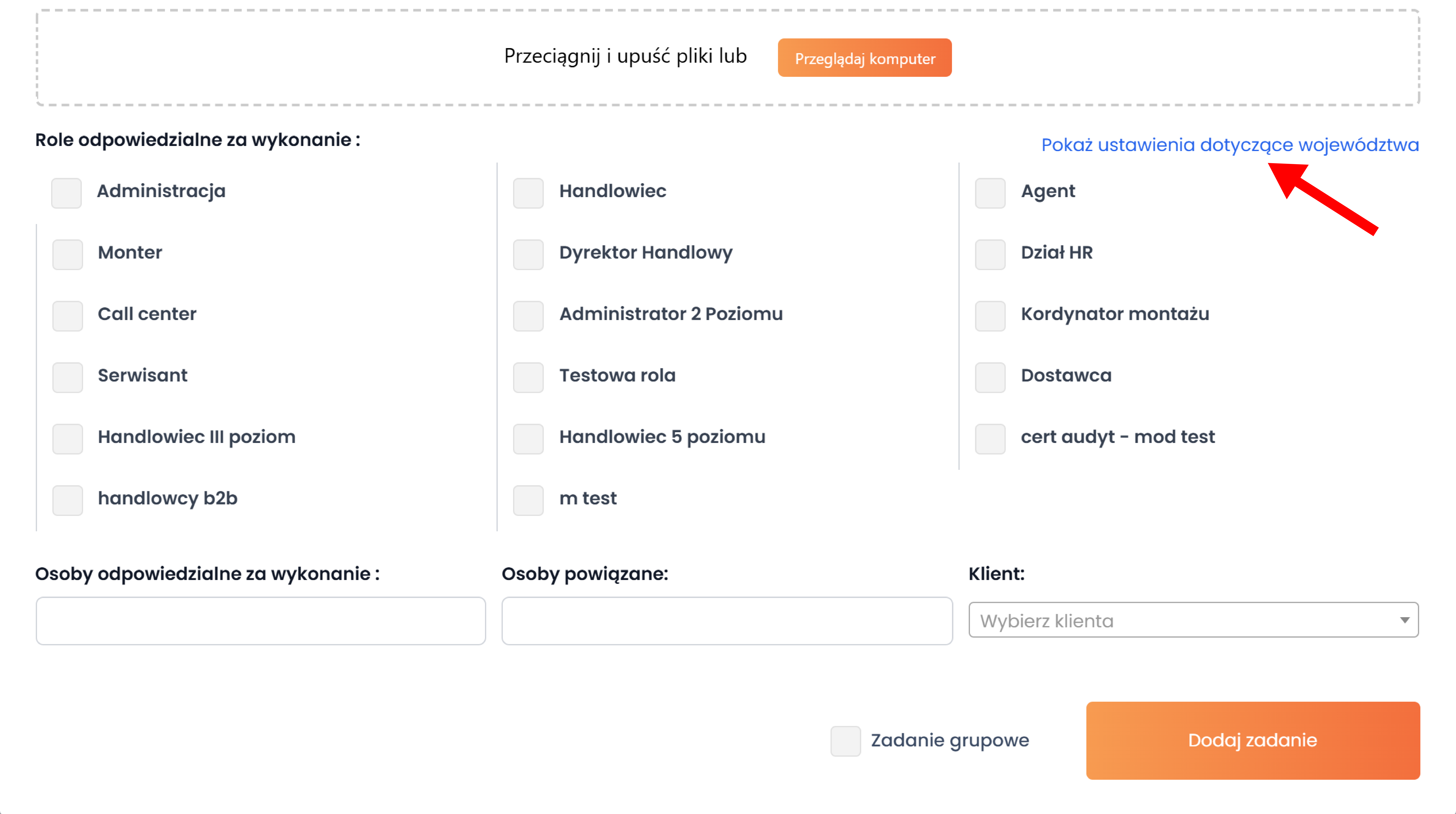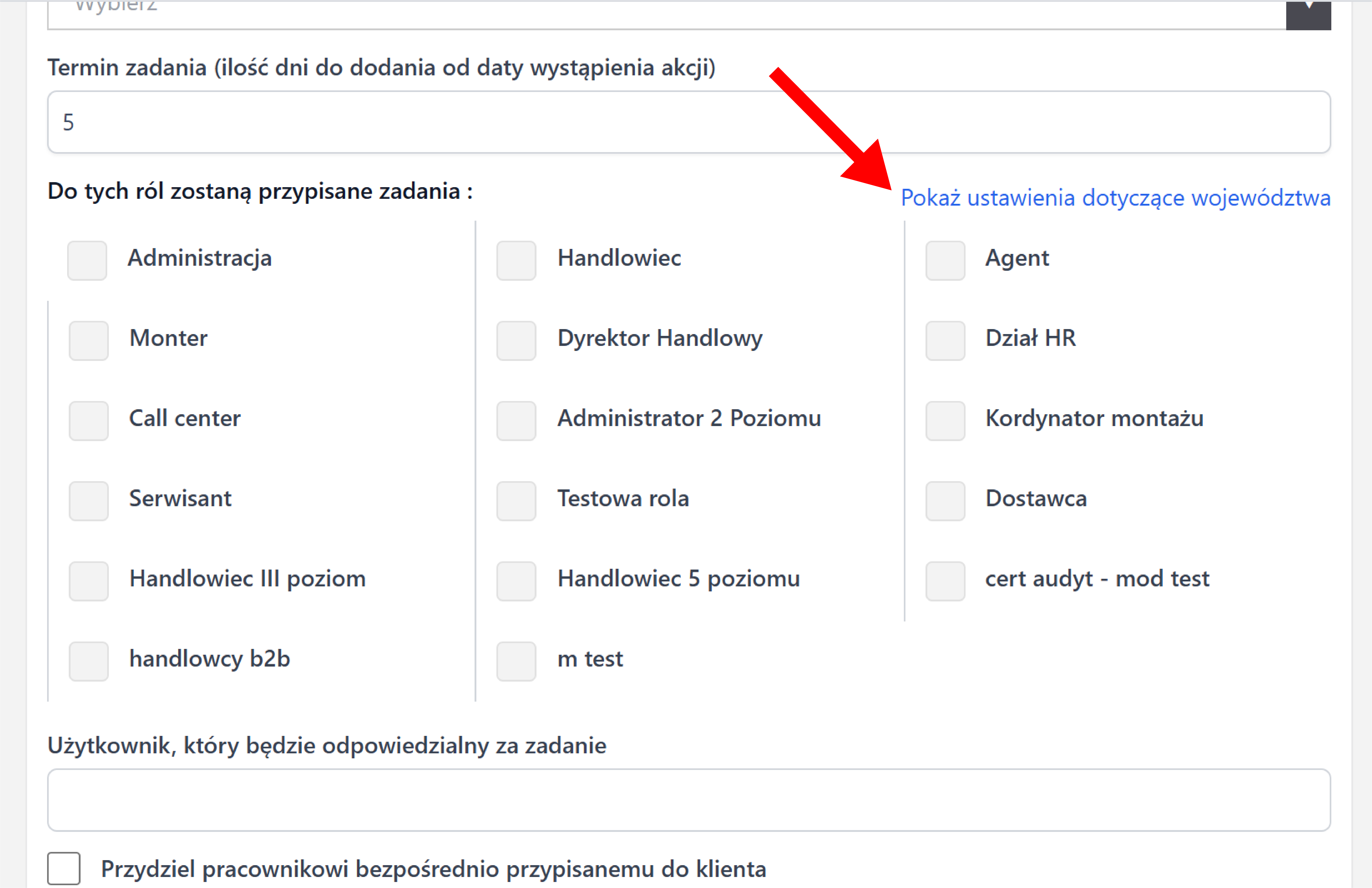 Podanie województwa pozwala na ograniczenie zadań przydzielonych do danej roli, jeśli zadanie zostało stworzone z takim ustawieniem. Dzięki temu użytkownik widzi jedynie te zadania, które dotyczą klientów z obsługiwanych przez niego województw