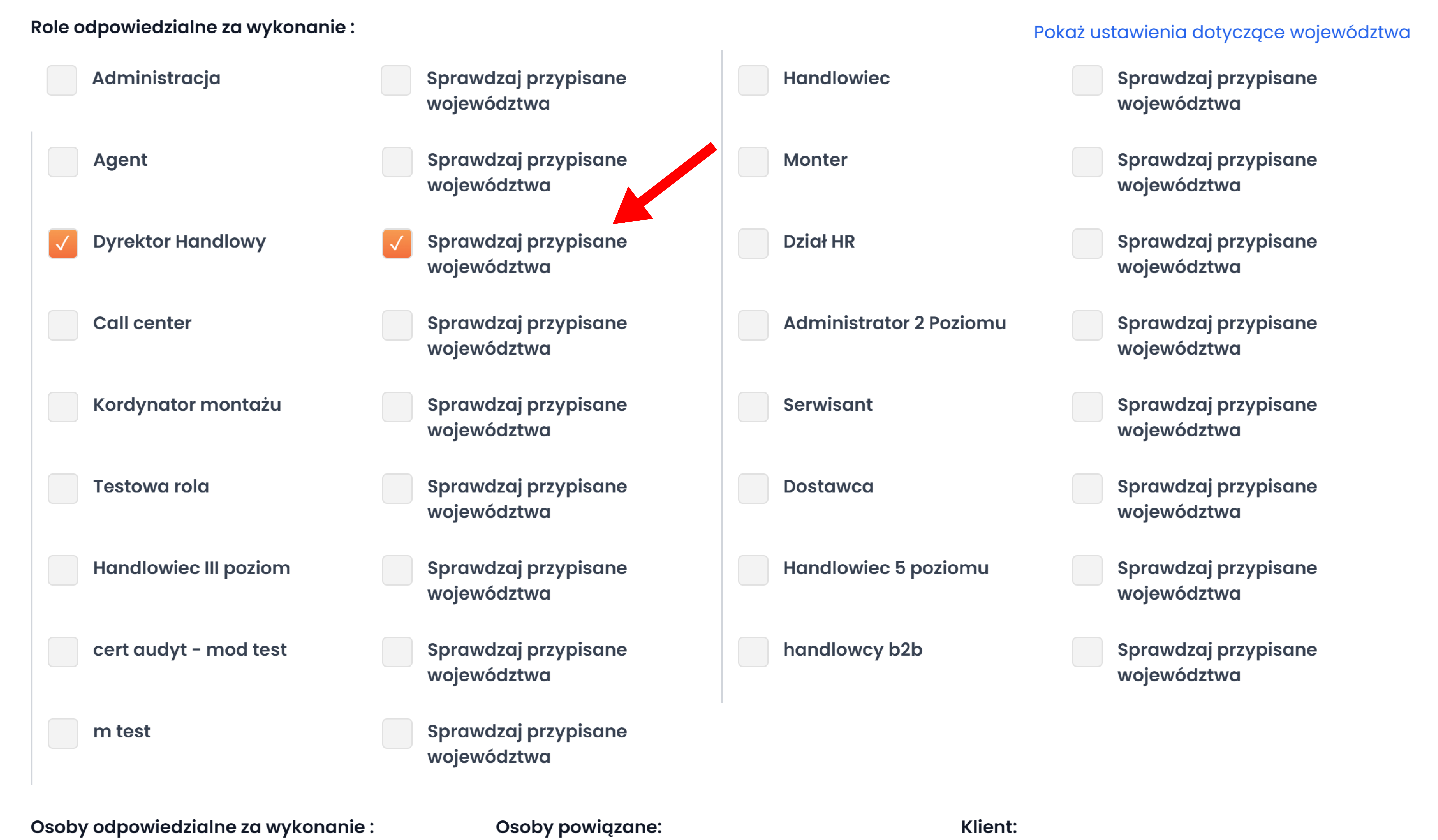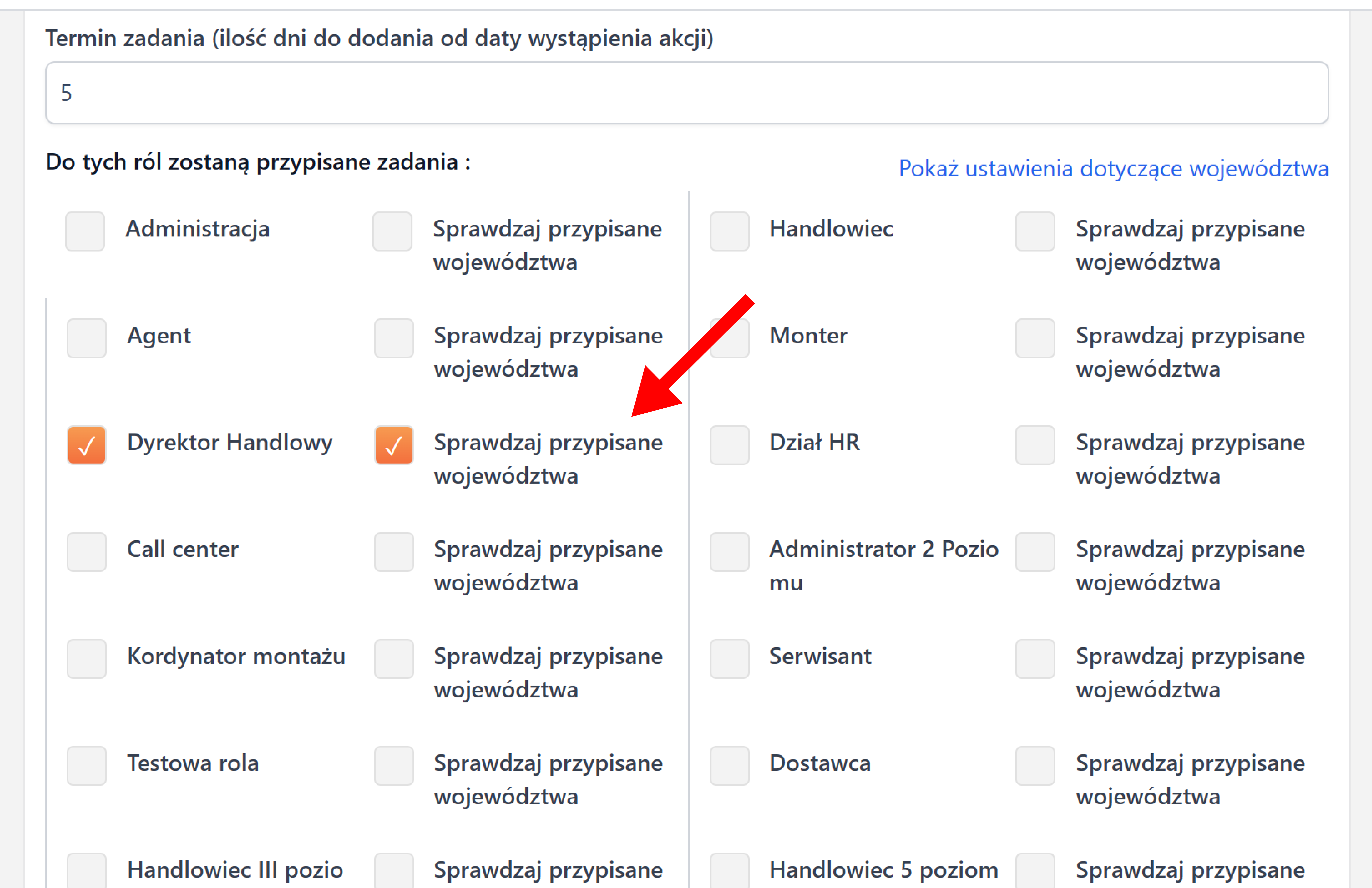 Po kliknięciu w tą opcję pojawią się dodatkowe checkboksy Sprawdzaj przypisane województwo przy każdej z ról. Dzięki tej opcji mamy możliwość zdecydować dla której roli w zadaniu należy sprawdzić przypisane województwo: