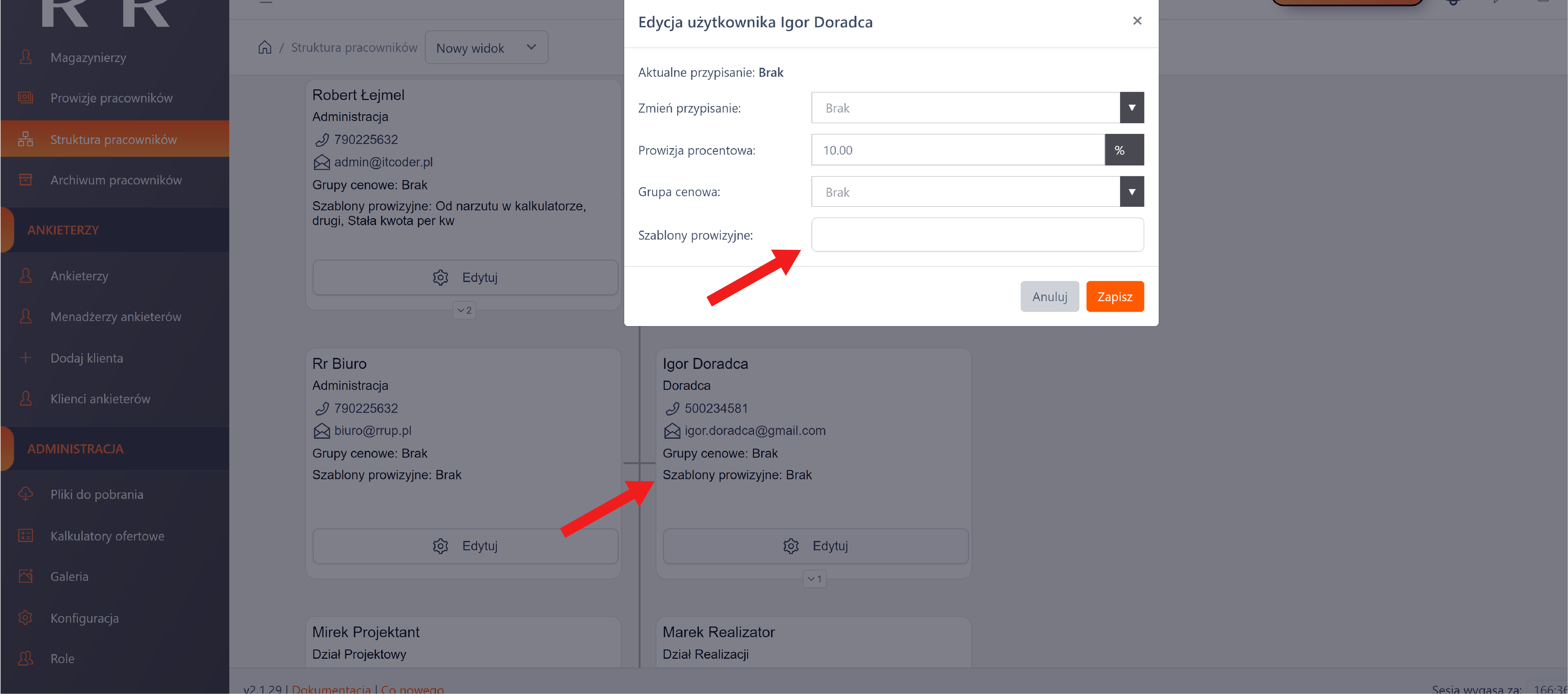 Uprawnienie stwarza możliwość przypisania szablonu prowizyjnego zarówno w obszarze "Struktury Pracowników",