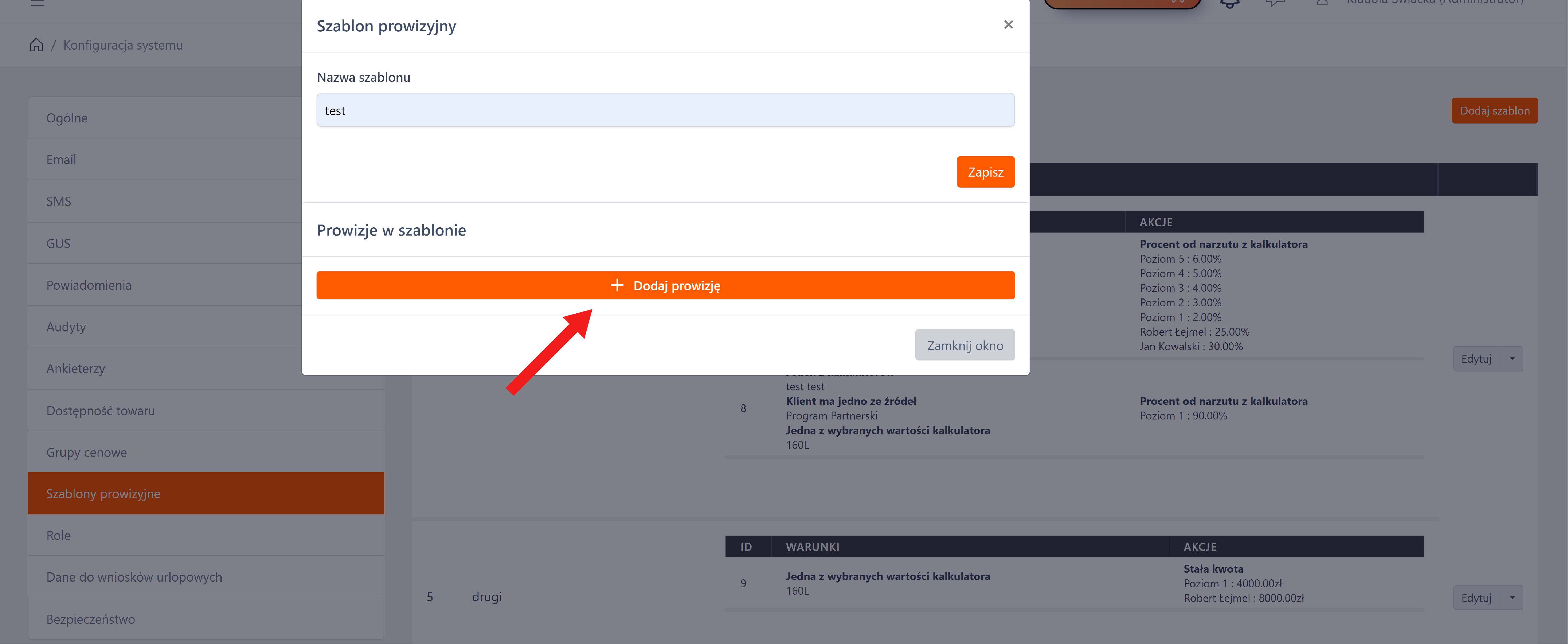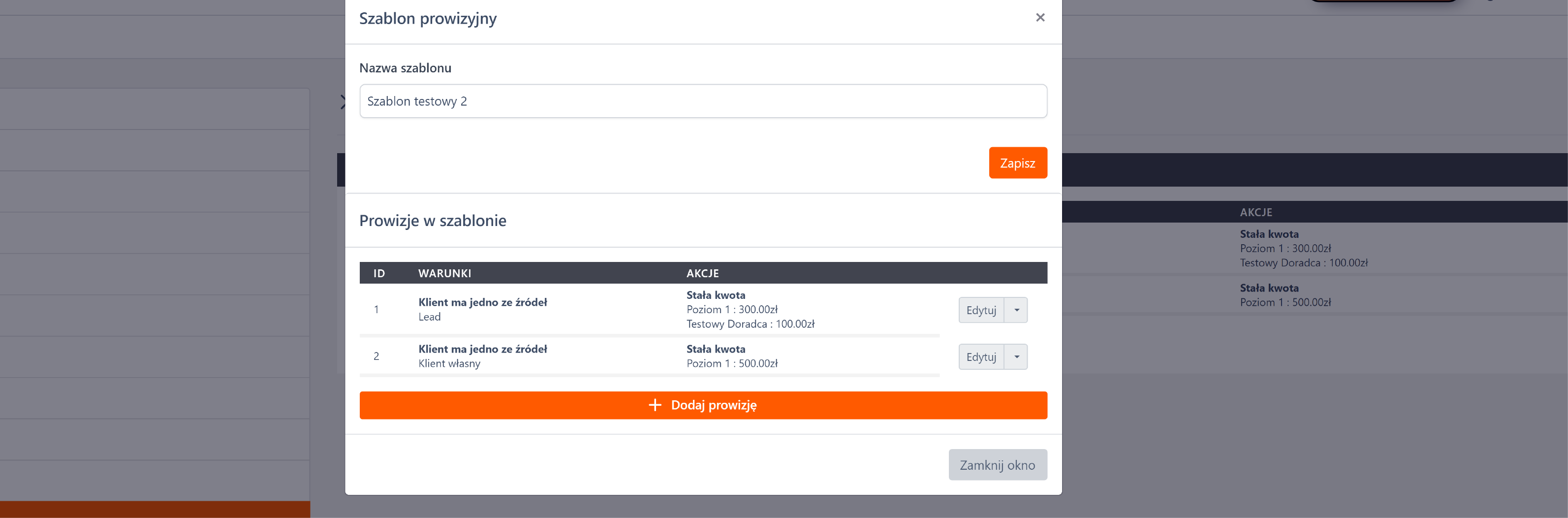 Cała struktura zakładki "Szablony Prowizyjne" umożliwia dodawanie nieskończenie wielu warunków i akcji, co pozwala na pełną personalizację schematów prowizyjnych, dostosowanych do unikalnych potrzeb firmy.