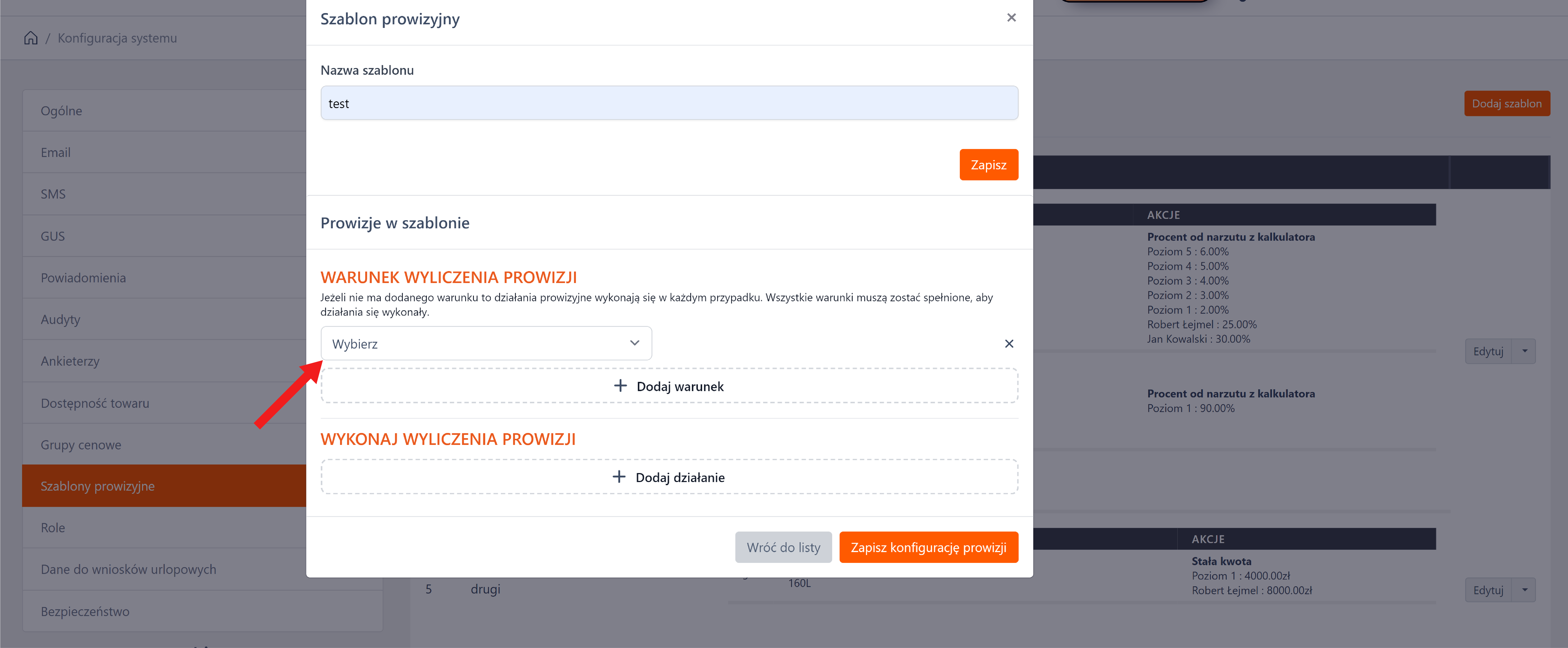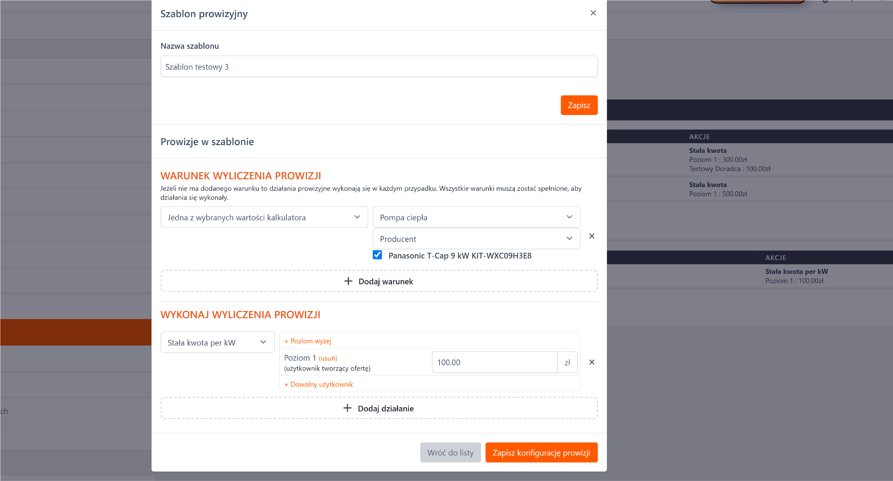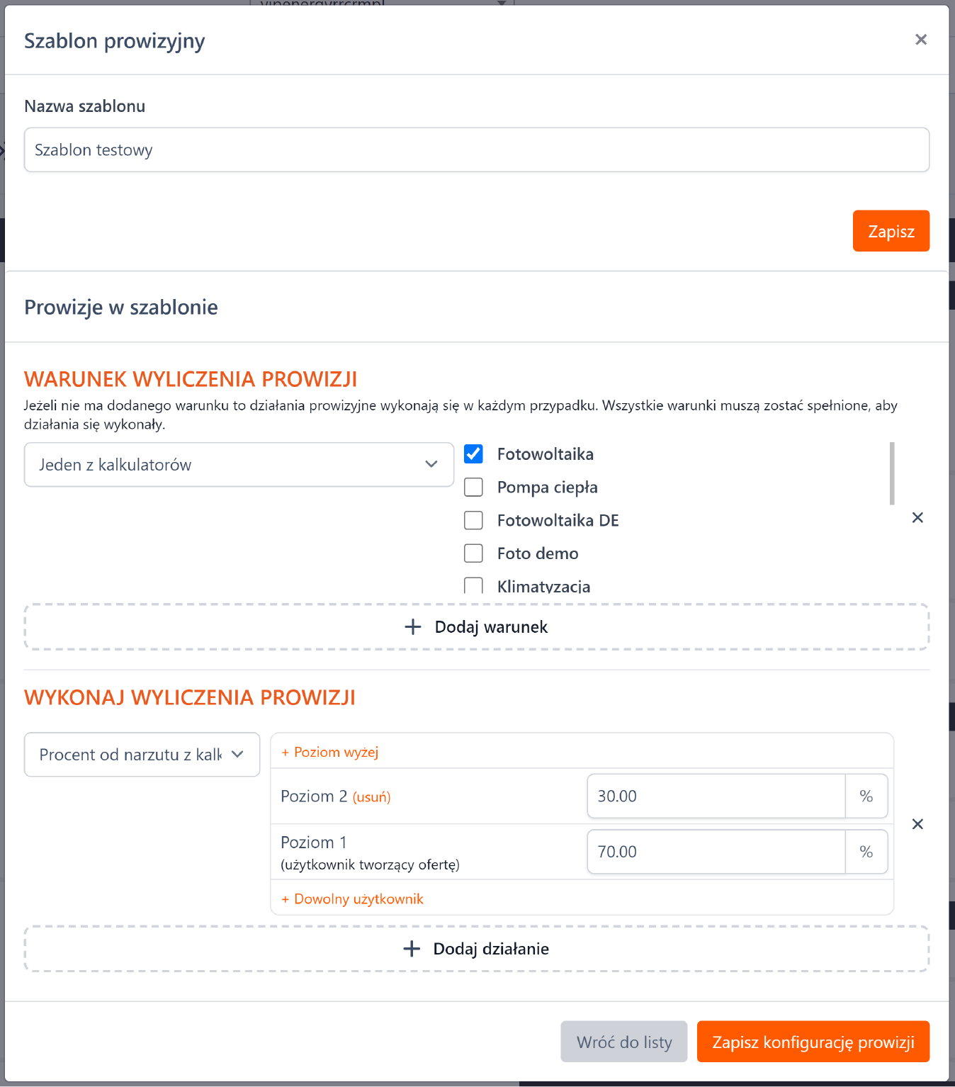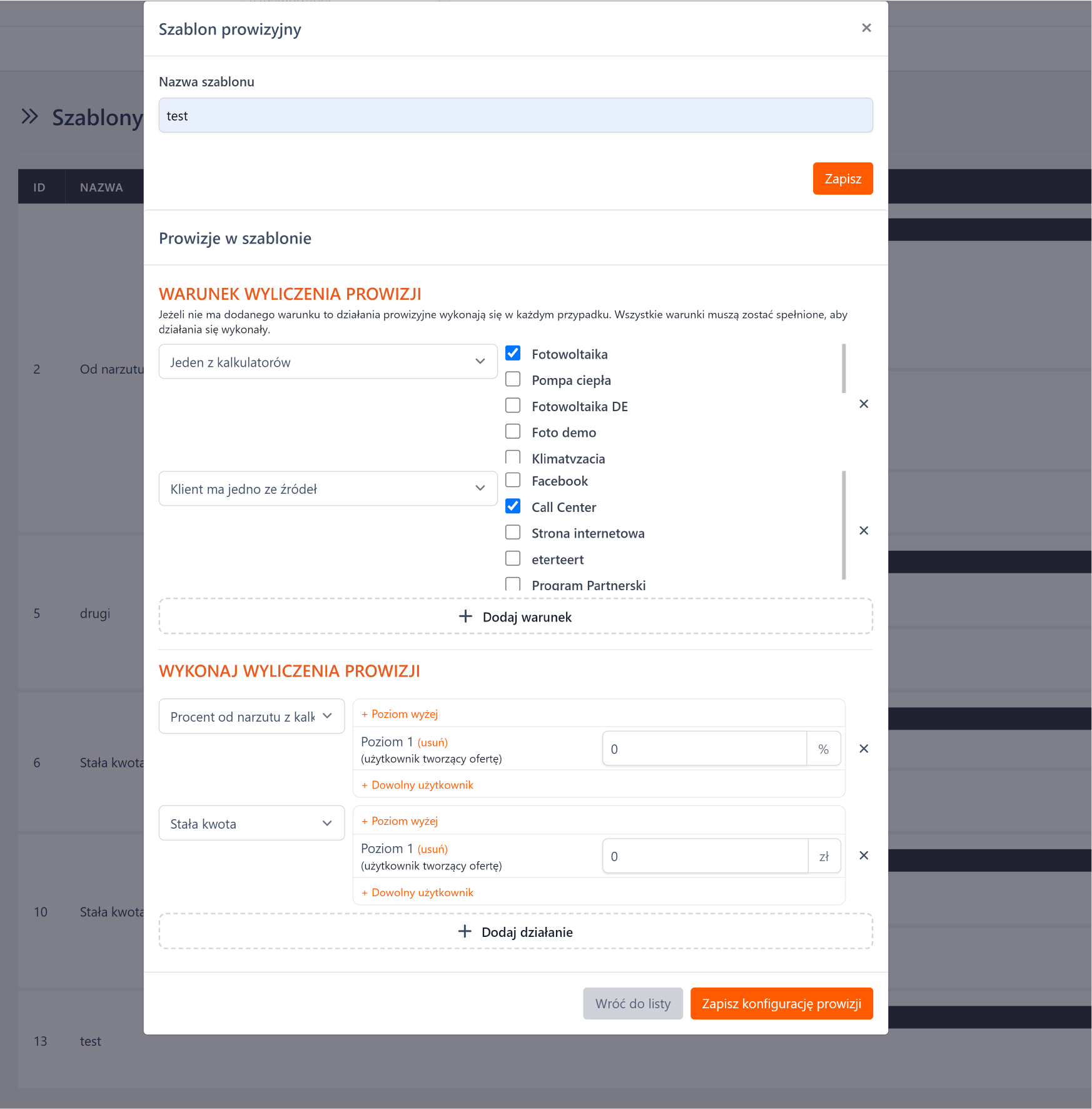 Po zdefiniowaniu warunków przechodzimy do dodawania akcji, czyli ustalania, w jaki sposób mają być realizowane wyliczenia prowizji. Oferuje to możliwość nadania procentu od narzutu z kalkulatora, co pozwala na elastyczne dostosowanie prowizji do indywidualnych parametrów. Istnieje również opcja ustalenia stałej kwoty, co umożliwia bardziej precyzyjne zarządzanie budżetem motywacyjnym.