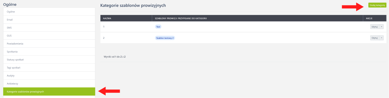 Panel zarządzania kategoriami szablonów prowizyjnych, pozwala na: