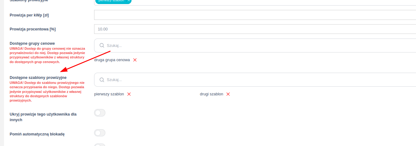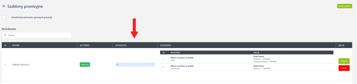 - Szablony oznaczone jako nieaktywne nie są wykorzystywane w wyliczeniach prowizji,