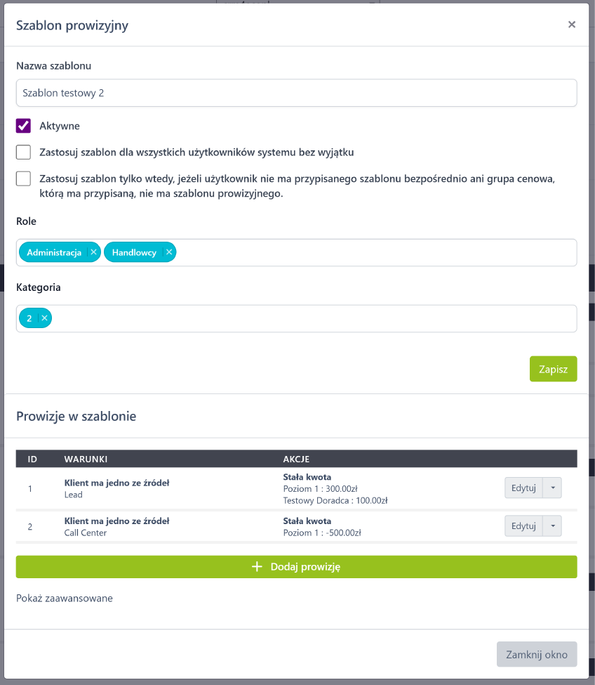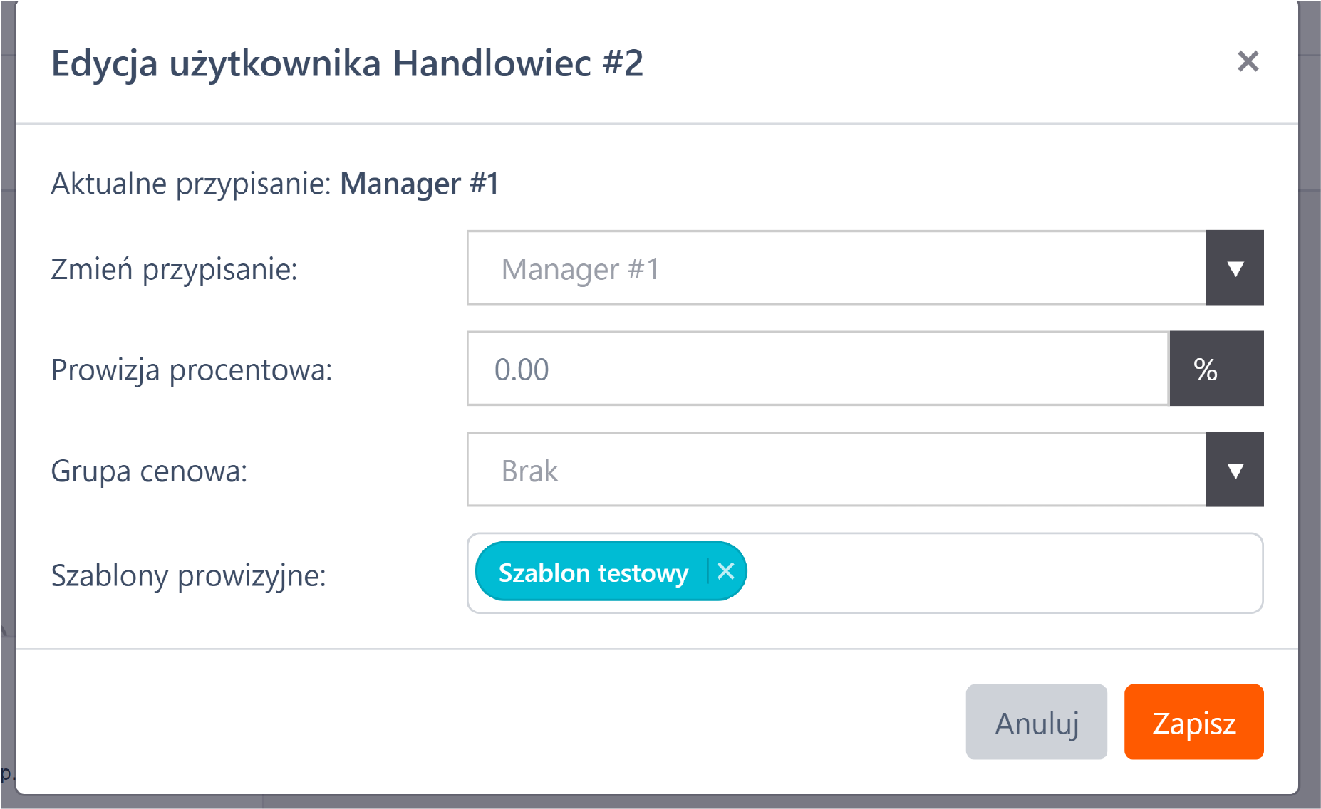 Następnie utworzony szablon prowizyjny należy przypisać do Handlowca #2: