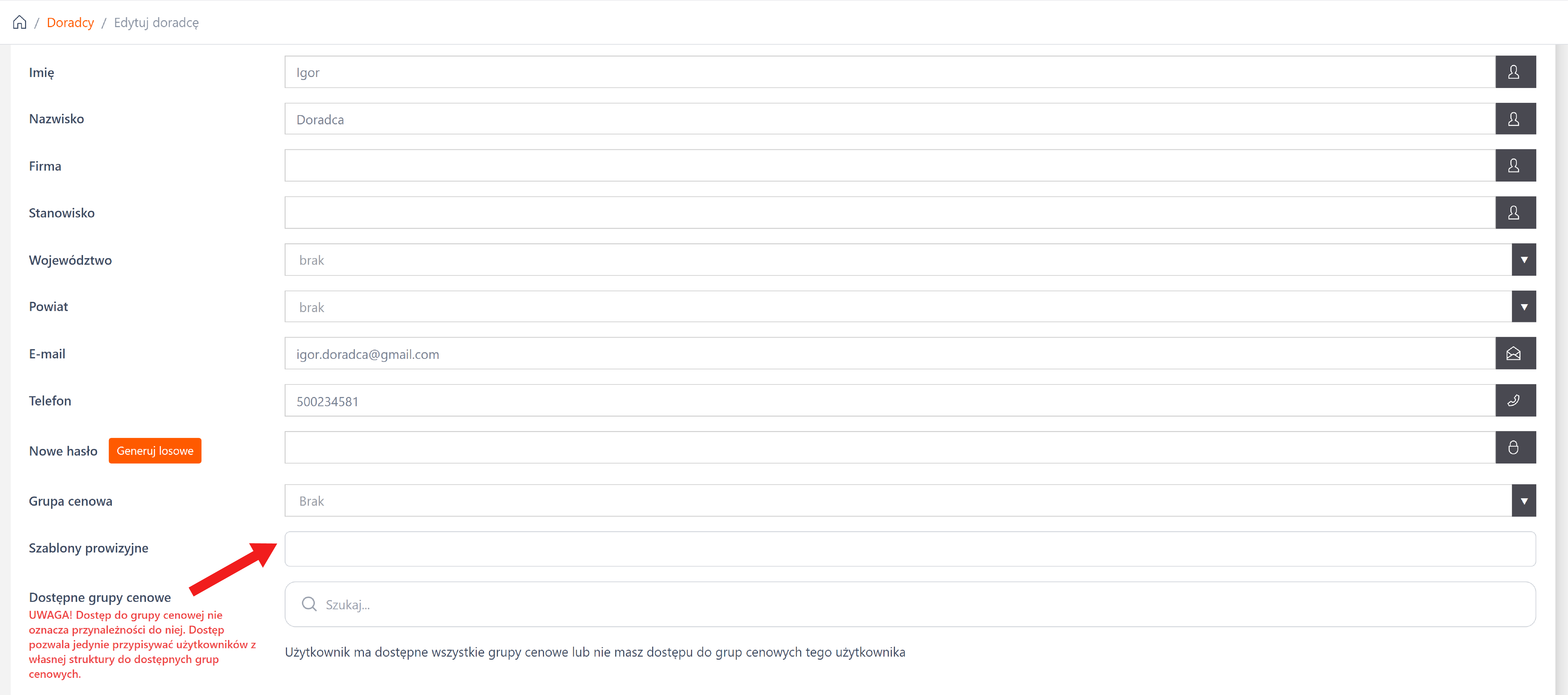 Istnieje możliwość przypisania utworzonego wcześniej szablonu prowizyjnego wybranej grupie cenowej. Dokonać można tego w ustawieniach głównych grupy cenowej w polu 1. "Szablony prowizyjne".