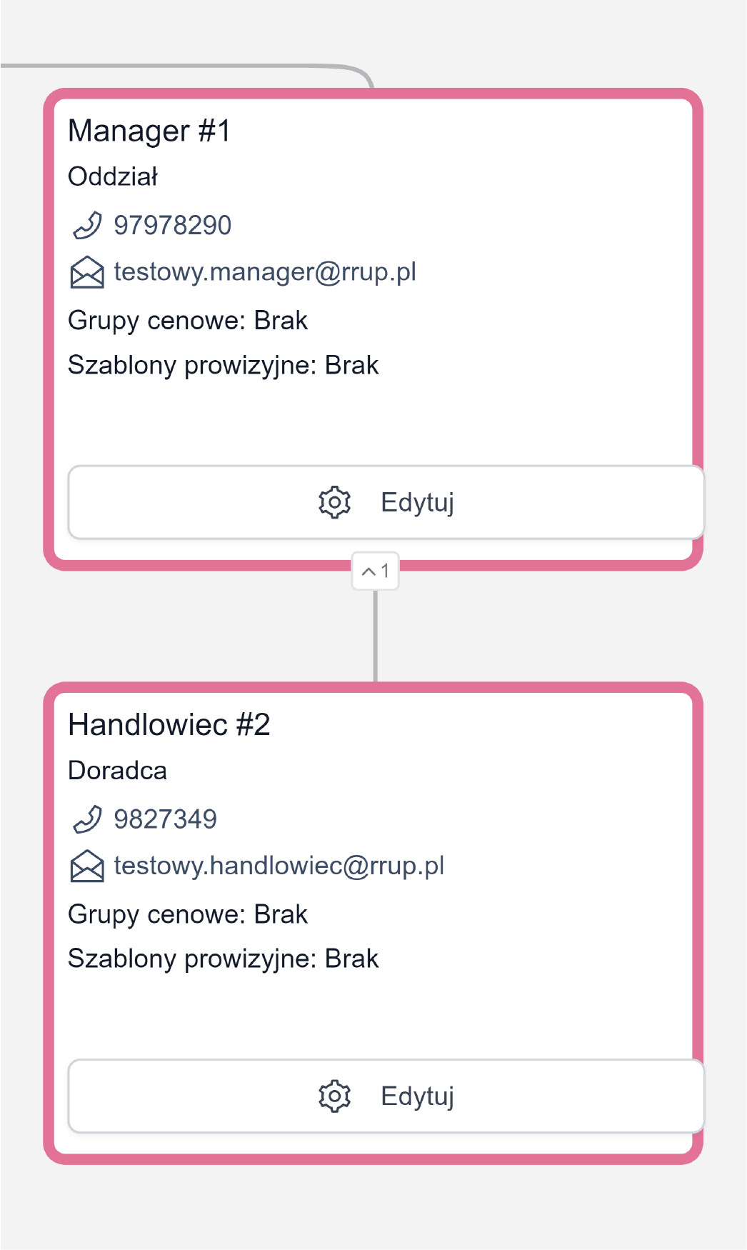 Firma pozyskuje leady i rozdysponowuje je pomiędzy handlowców. Gdy Handlowiec #2 doprowadzi do zawarcia umowy z leadem to uzyska 300 zł. Natomiast jeśli doprowadzi do podpisania umowy z klientem pozyskanym samodzielnie to otrzymuje 500 zł. Dodatkowo jeśli lead podpisuje umowę, prowizję w kwocie 100 zł otrzymuje również Testowy Doradca -> szef Działu Pozyskiwania Leadów.