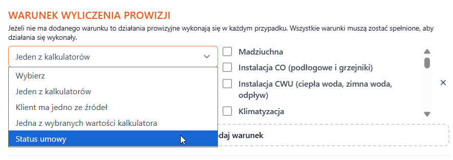 Po zdefiniowaniu warunków przechodzimy do dodawania akcji, czyli ustalania, w jaki sposób mają być realizowane wyliczenia prowizji. Oferuje to możliwość nadania procentu od narzutu z kalkulatora, co pozwala na elastyczne dostosowanie prowizji do indywidualnych parametrów. Istnieje również opcja ustalenia stałej kwoty, co umożliwia bardziej precyzyjne zarządzanie budżetem motywacyjnym.