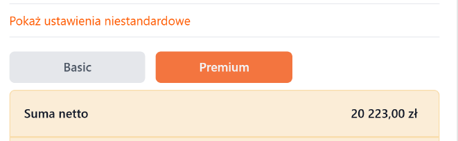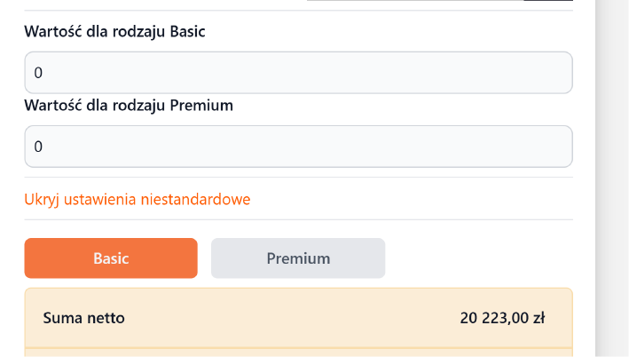 Po rozwinięciu "Pokaż ustawienia niestandardowe", użytkownik ma możliwość przypisania konkretnych wartości dla wcześniej zdefiniowanych rodzajów narzutów.