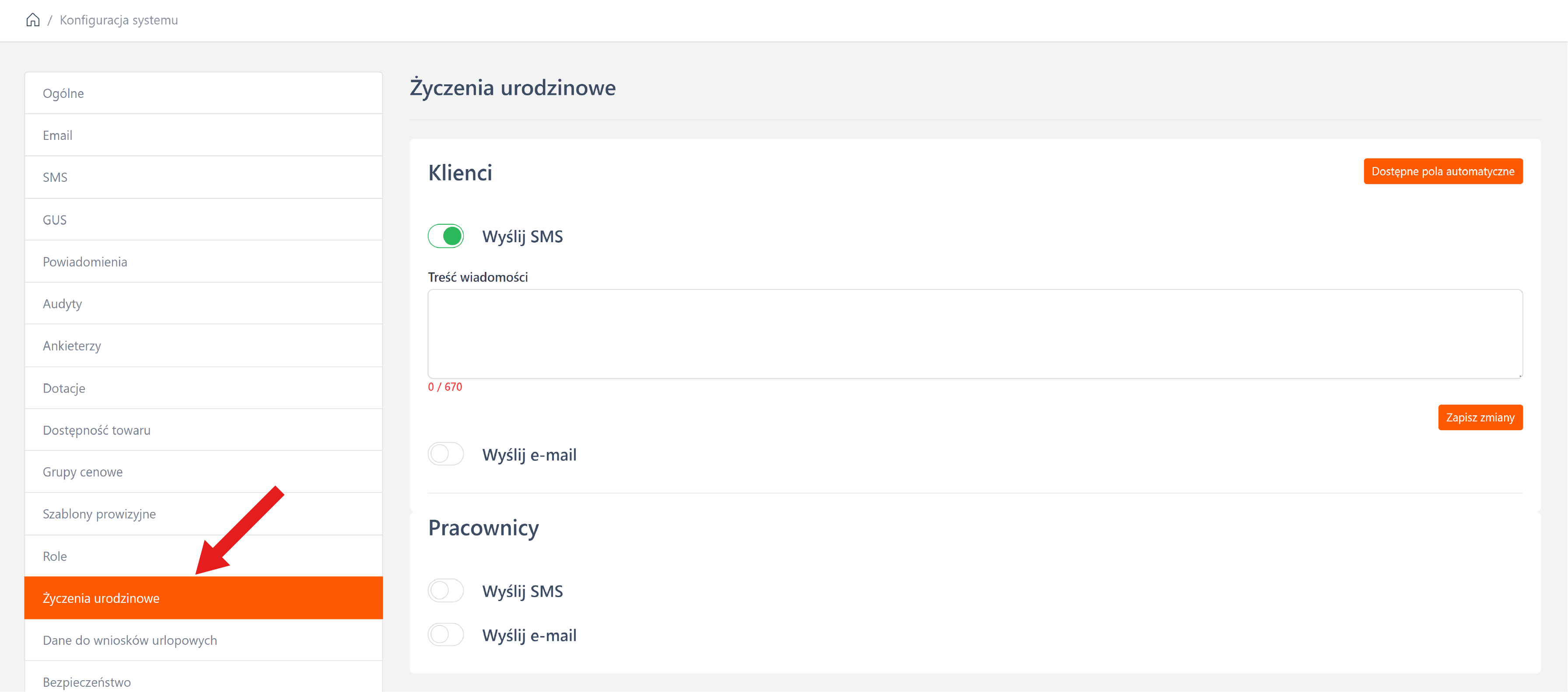 W ramach konfiguracji systemu CRM, w zakładce "Życzenia Urodzinowe", jest możliwość wysyłania życzeń zarówno dla klientów, jak i pracowników. System pozwala na dostosowanie treści życzeń oraz wyboru formy dostarczenia, tj. SMS lub e-mail.