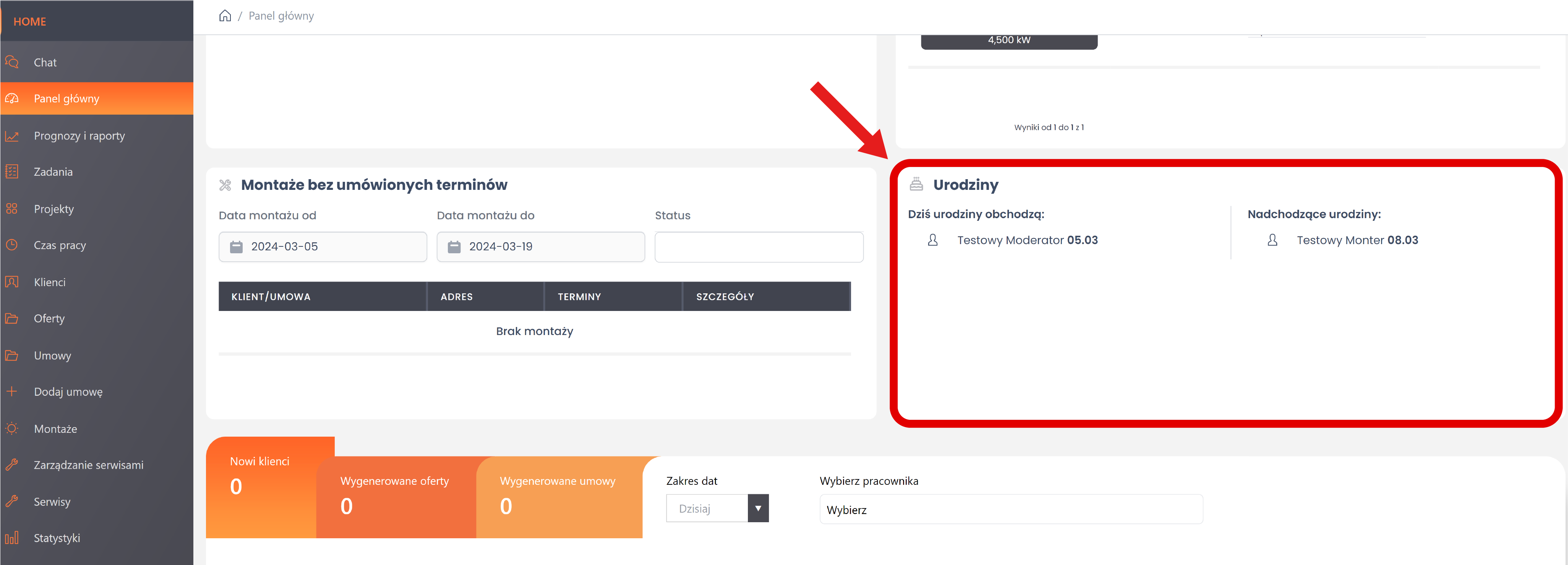 Dodatkowo, w zakładce "Panel główny" dostępny jest widżet dotyczący urodzin pracowników.