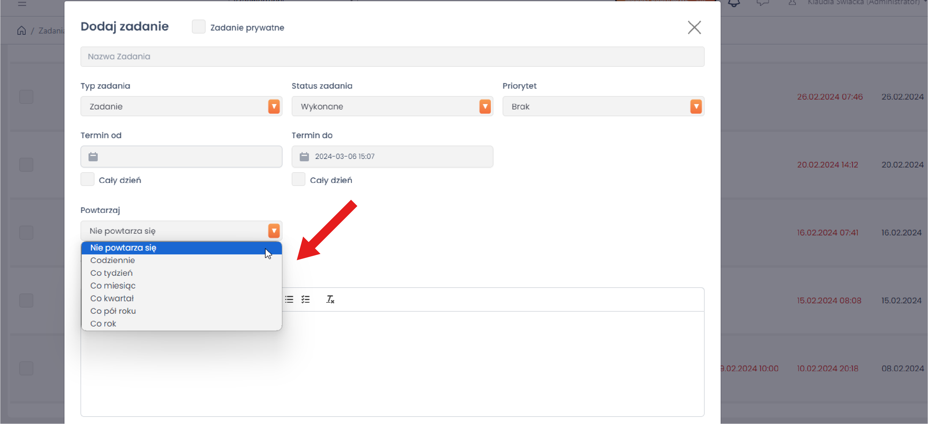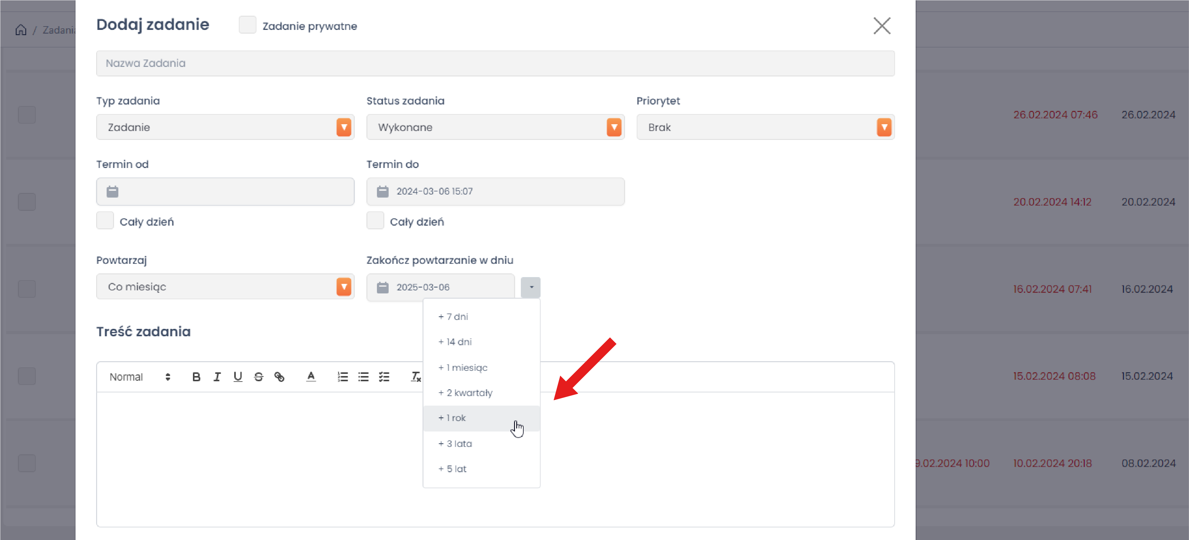 Wystarczy wybrać datę rozpoczęcia zadania, okres cykliczności (na przykład: co tydzień, co miesiąc, co kwartał itd.). Po zapisaniu konfiguracji, system automatycznie generuje identyczne zadania w wybranych interwałach czasowych.