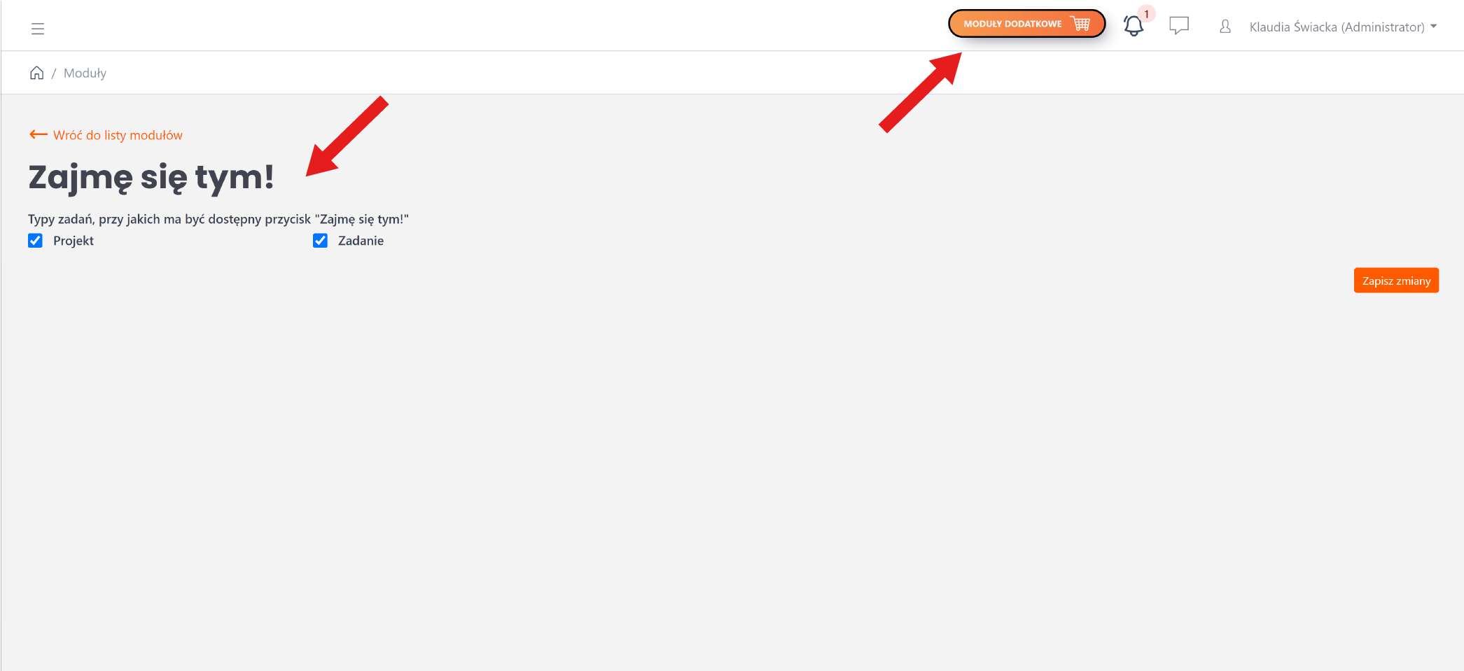 W sekcji "Moduły dodatkowe" administrator ma możliwość określenia, w jakich typach zadań chce korzystać z tej funkcji.