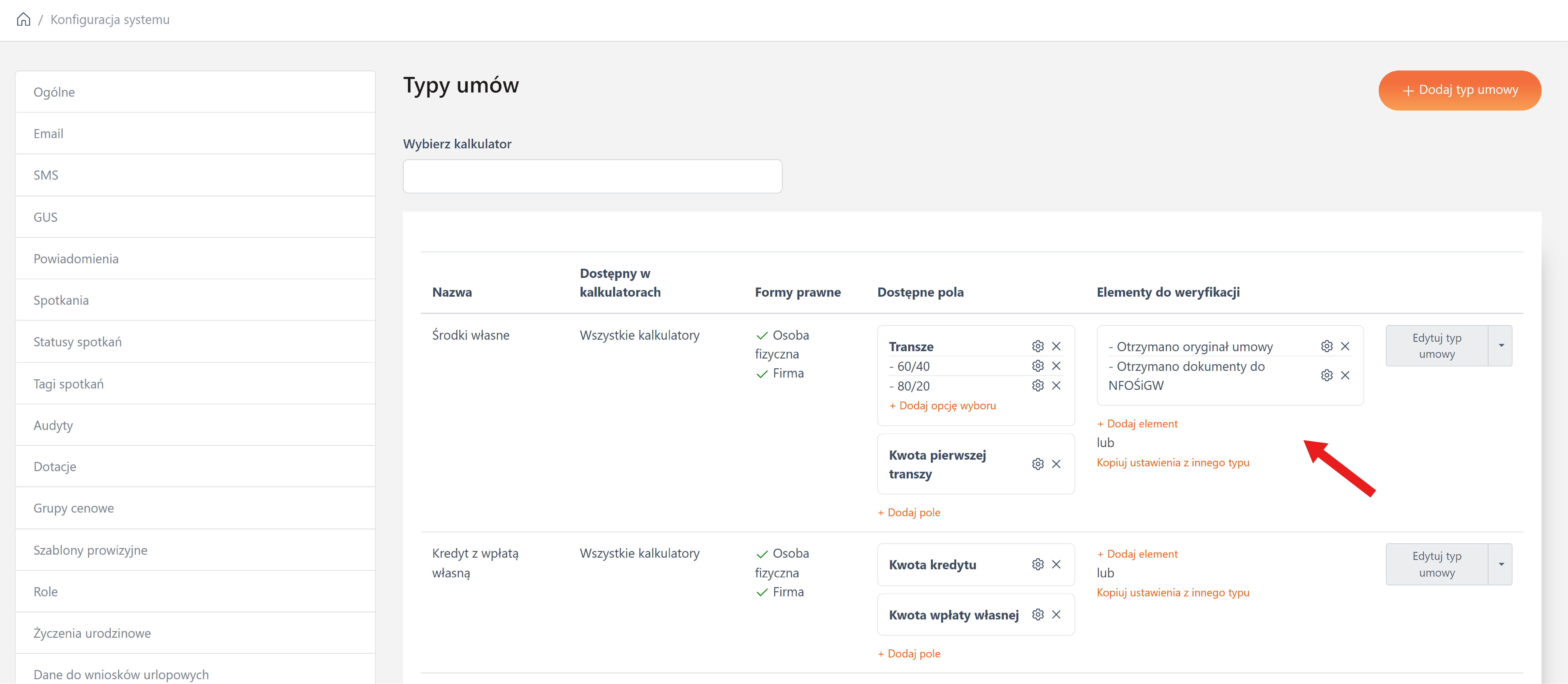 W ramach konfiguracji typów umów, administratorzy mogą definiować elementy do weryfikacji, dodając nowe lub korzystając z gotowych ustawień skopiowanych z innych typów umów.