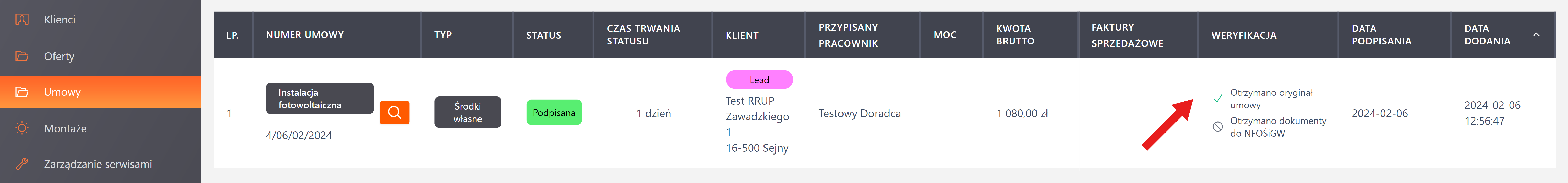 Dodatkowo, na liście umów można wyświetlać te same elementy weryfikacji, ale z odpowiednimi symbolami wskazującymi na ich status.