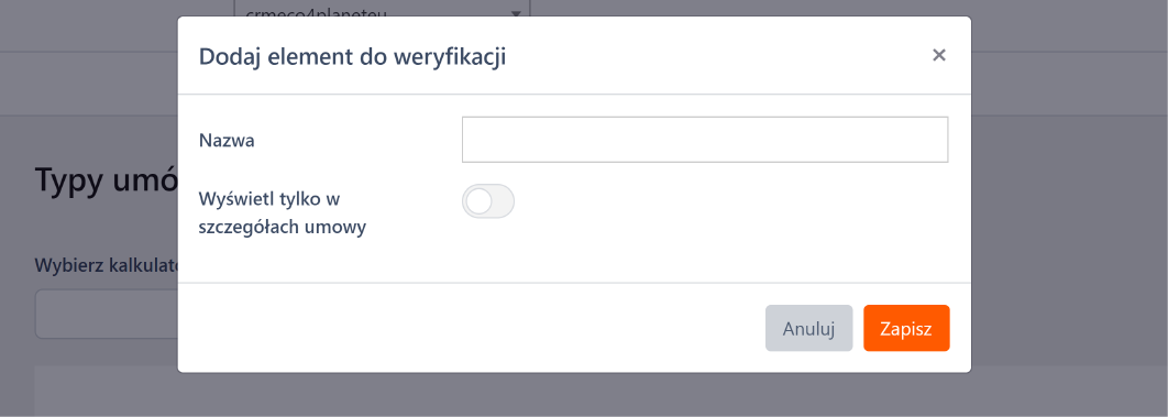 Dodatkowo, przy dodawaniu elementu weryfikacji, jest możliwość zdecydowania, czy dany element ma być wyświetlany tylko w szczegółach umowy, czy także na liście umów. Domyślnie, elementy są wyświetlane na liście umów, ale można skonfigurować je tak, aby były widoczne jedynie w szczegółach umowy.