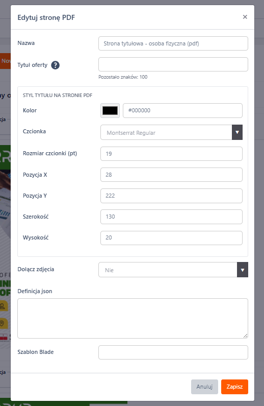 Dzięki temu możliwe jest dopasowanie tytułu do projektu graficznego strony tytułowej oraz zachowanie spójnego wyglądu generowanych ofert PDF.