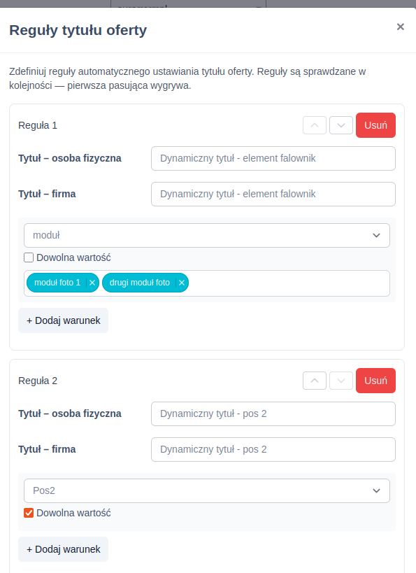 Zarządzanie priorytetami: Kolejność sprawdzania reguł można dowolnie zmieniać za pomocą przycisków „góra”/„dół”, co pozwala na precyzyjne sterowanie tym, który tytuł wyświetli się w danej konfiguracji.