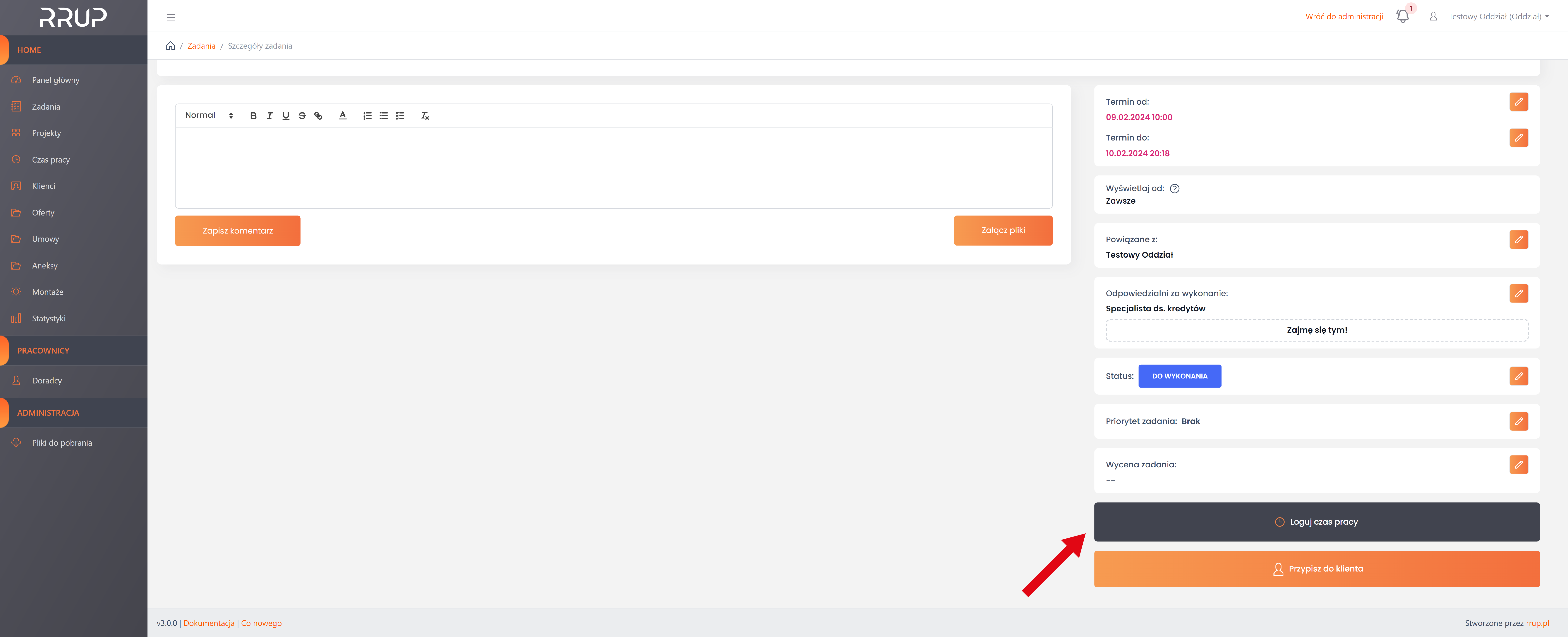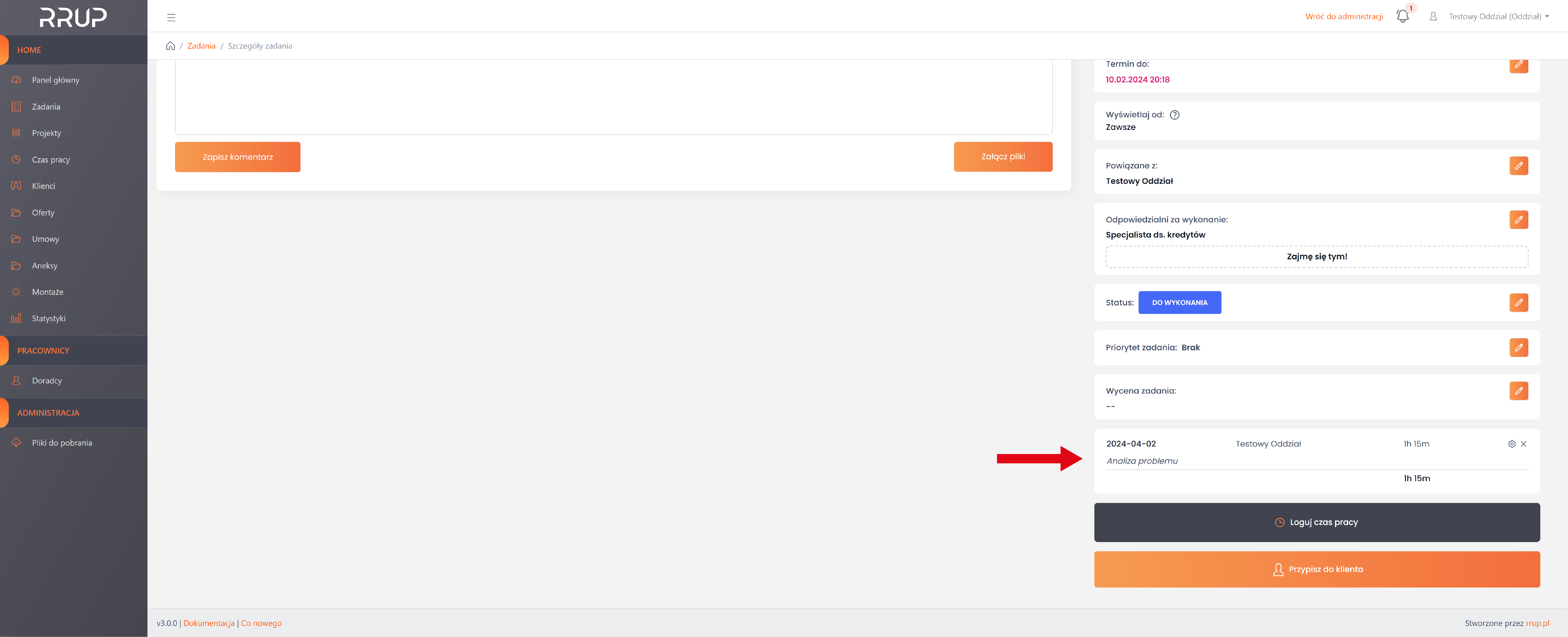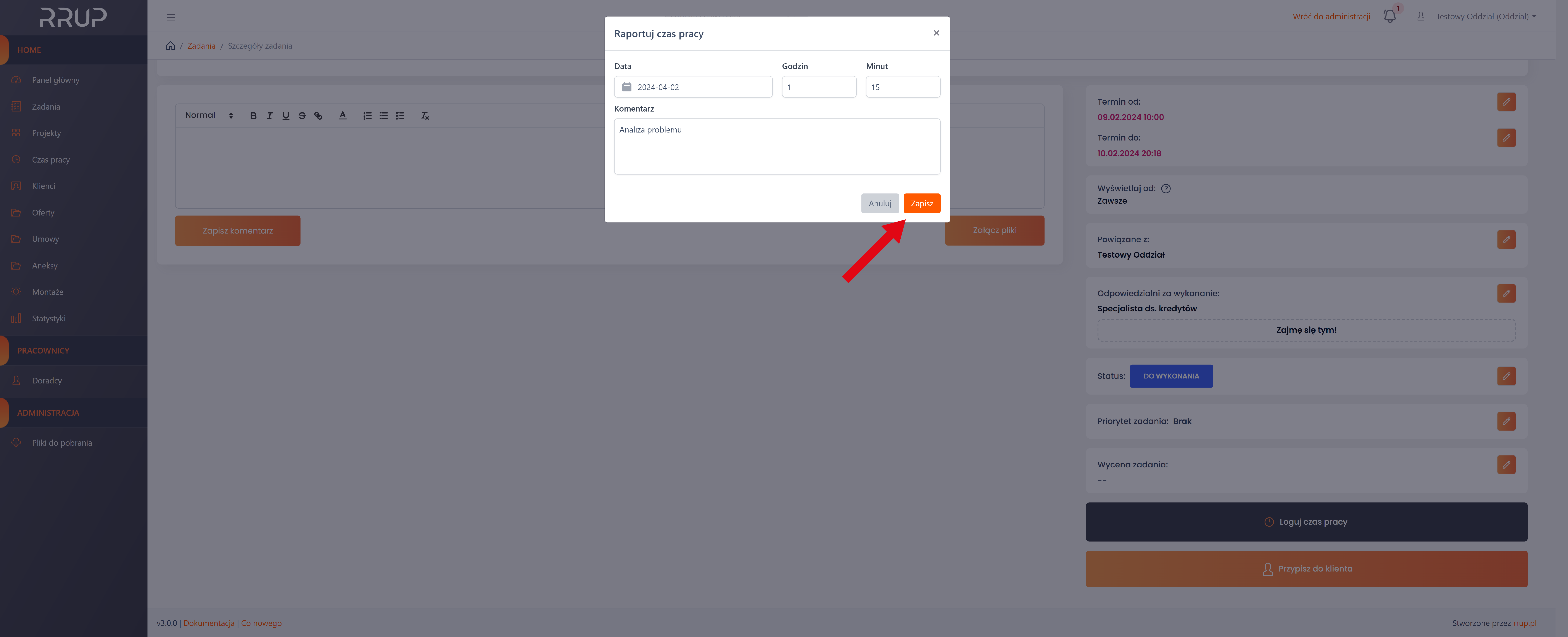 Po kliknięciu w przycisk "Loguj czas pracy", użytkownik może określić czas poświęcony na wykonanie zadania oraz dodać komentarz.