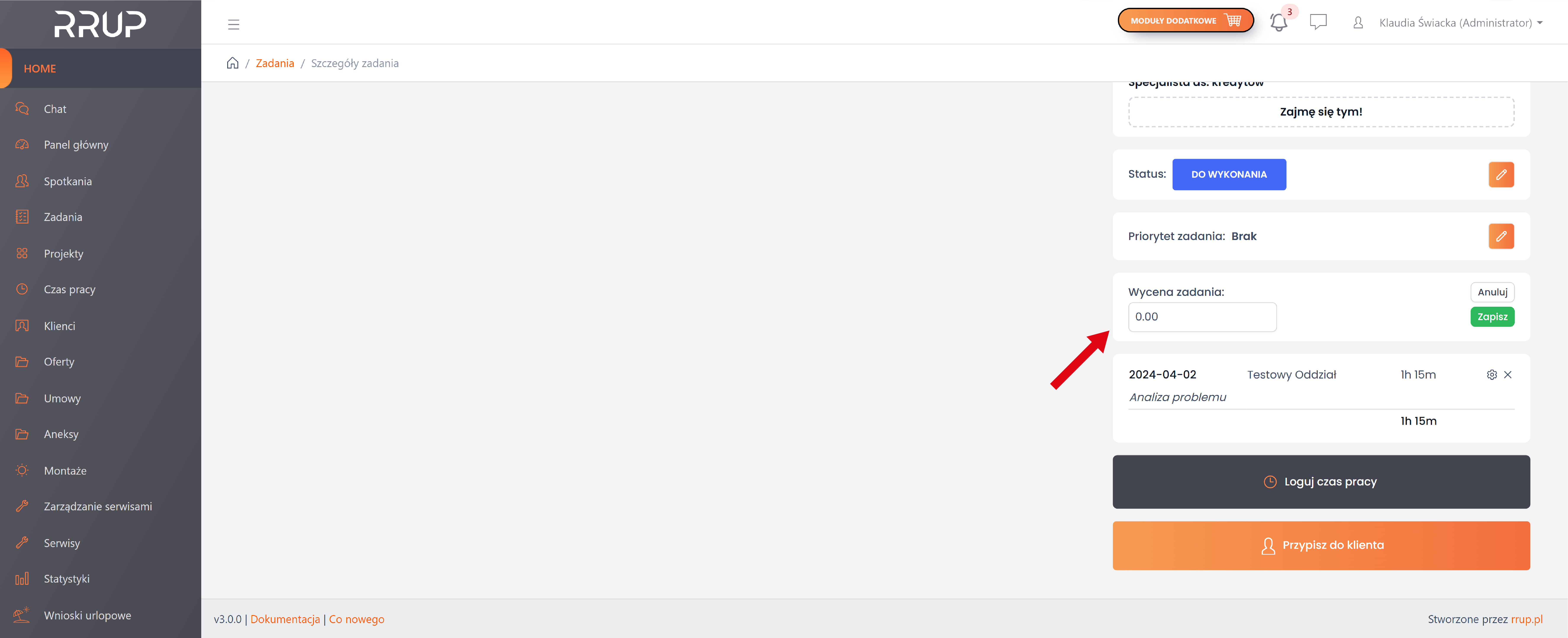 Natomiast, osoby z uprawnieniem "Może ustawić wycenę zadania",mają możliwość nadania wyceny poszczególnym zadaniom.