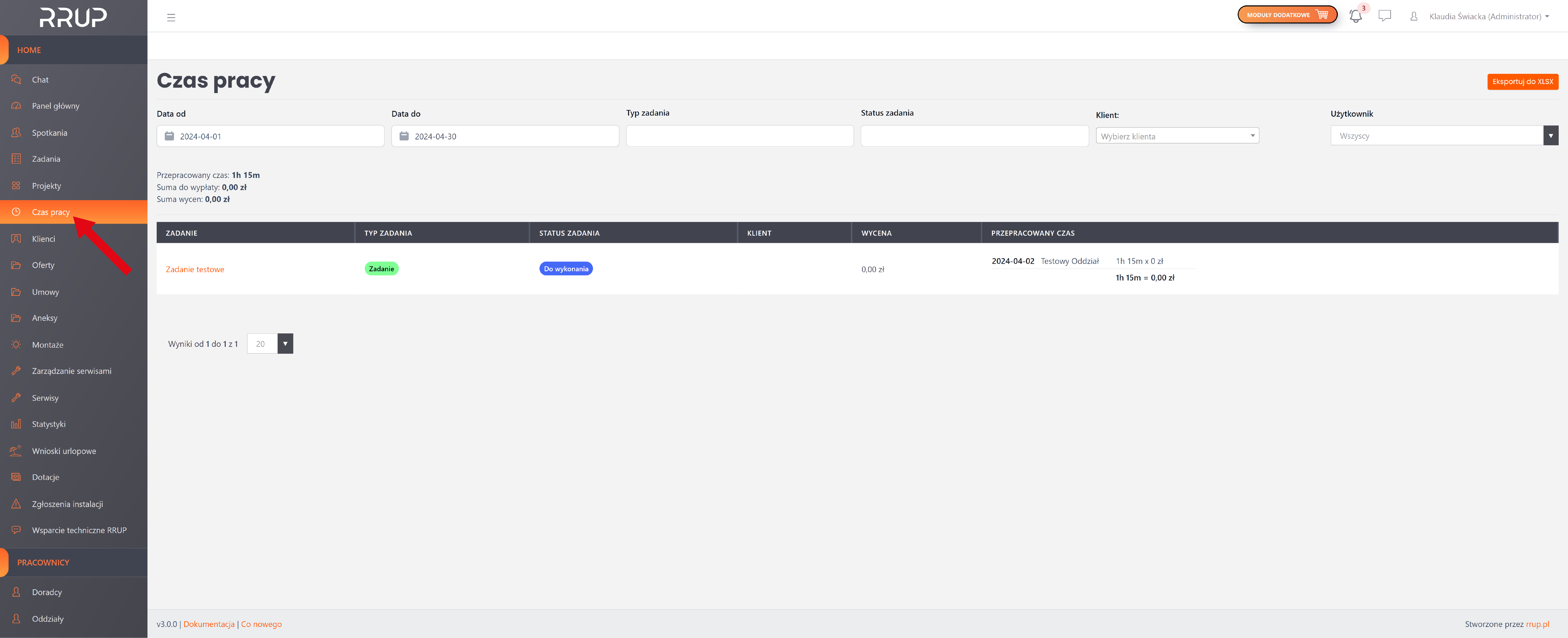 W tej sekcji można określić przedział czasowy, w jakim chcemy obejrzeć przepracowany czas danego użytkownika, określić typ oraz status zadania, wybrać klienta i konkretnego użytkownika. Dodatkowo, istnieje opcja wyeksportowania danych do formatu XLSX, co ułatwia dalszą analizę i raportowanie.