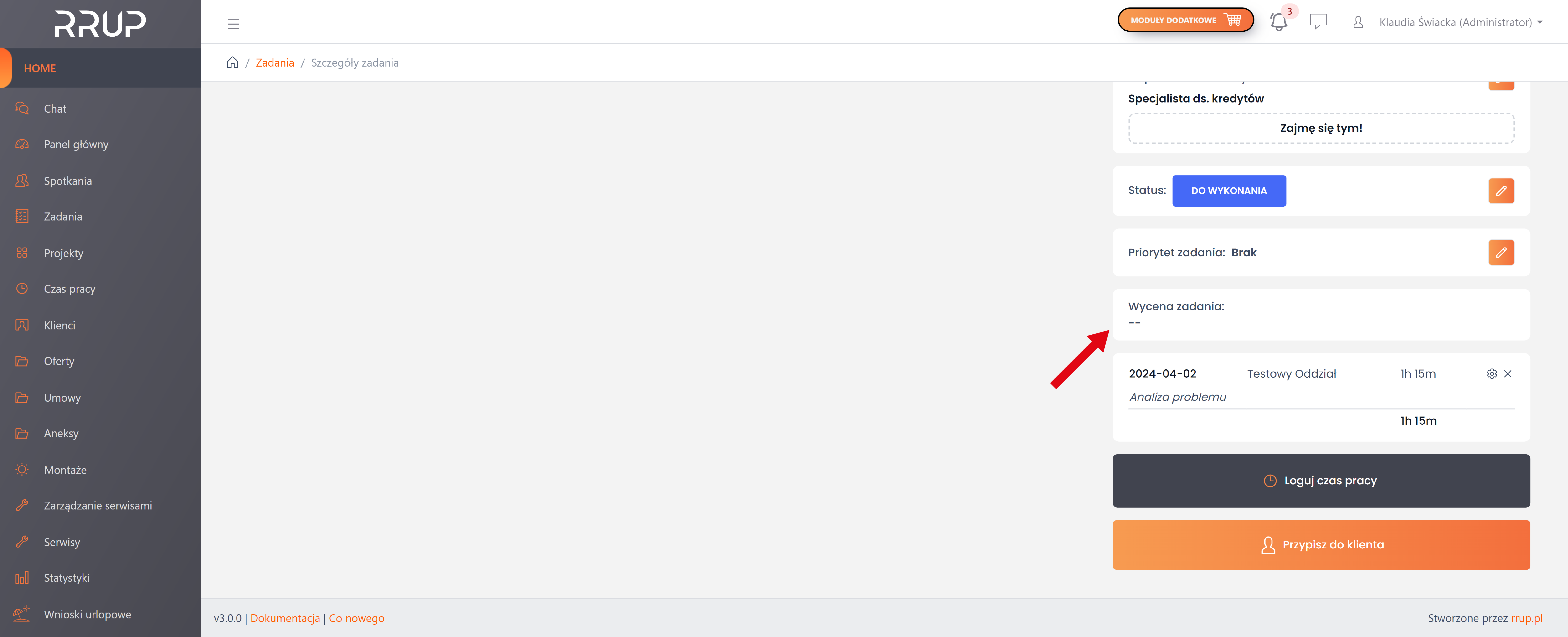 Użytkownicy posiadający uprawnienie "Widzi wyceny zadań" mogą sprawdzić, na ile zostało wycenione konkretne zadanie.