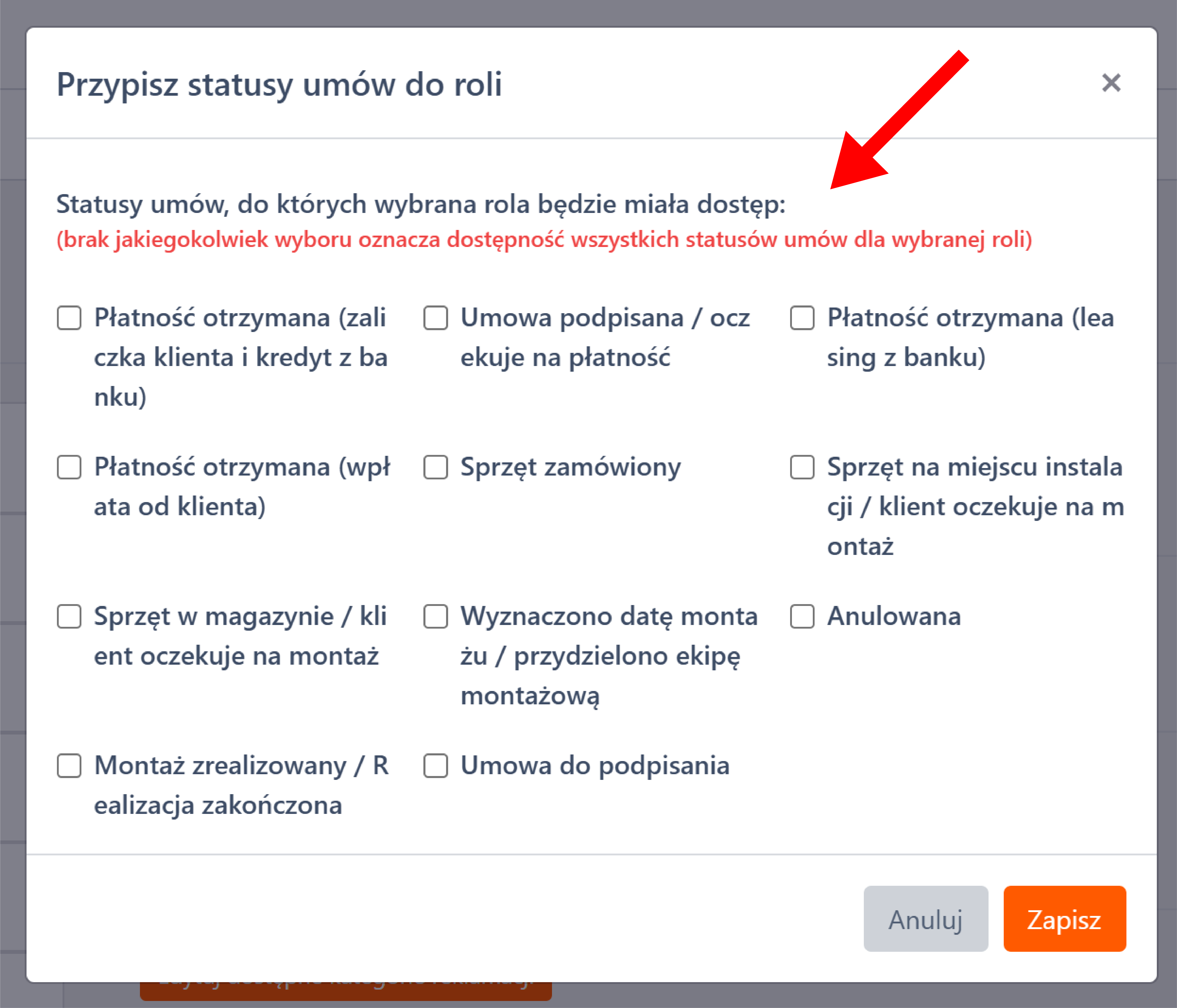 Klikając w konkretne ograniczenie wyświetli się okienko, w którym możemy określić np do jakich statusów dana rola będzie miała dostęp (brak jakiegokolwiek wyboru oznacza dostępność wszystkich statusów umów dla wybranej roli):