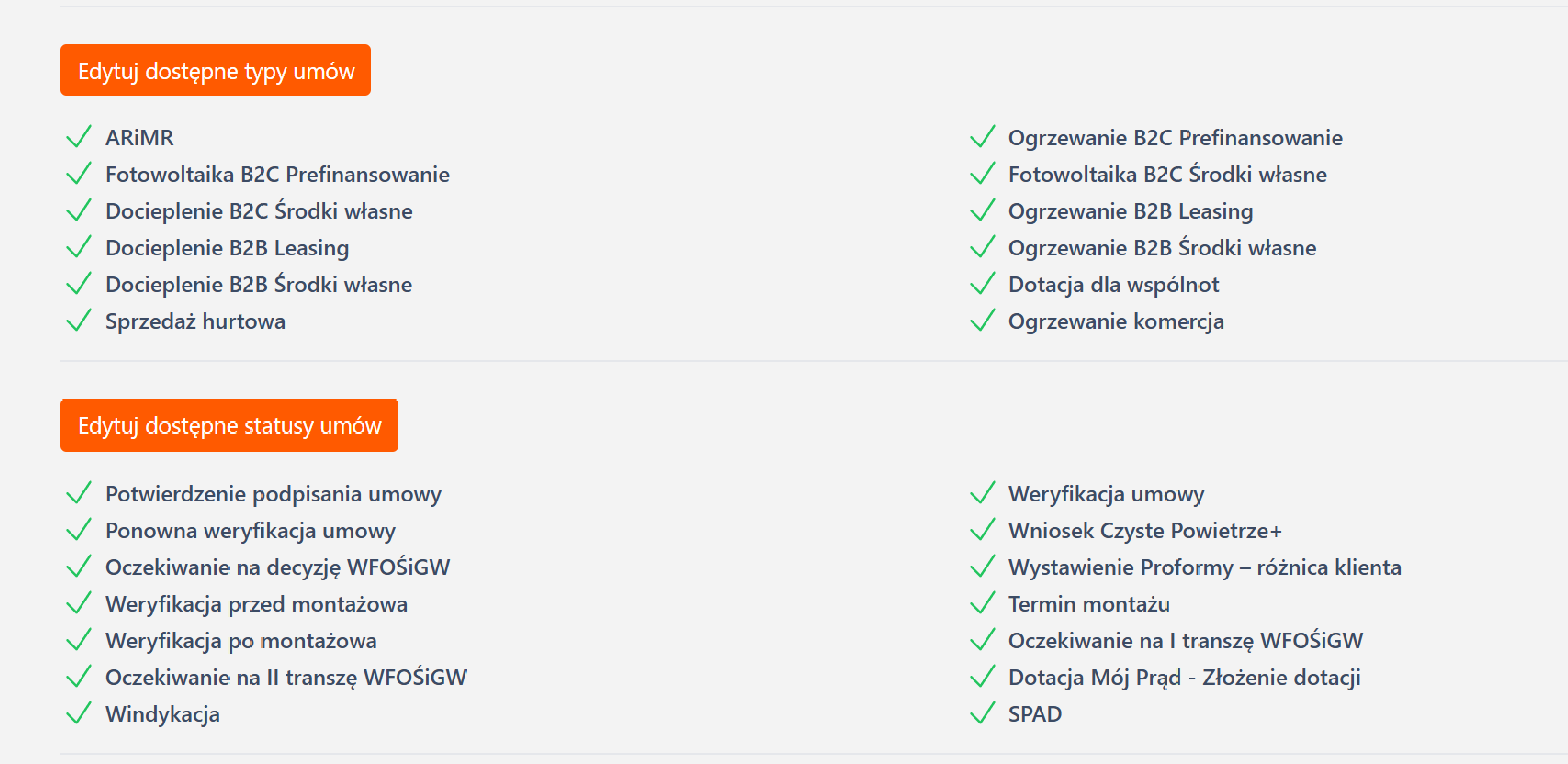 -Ogranicz wybór kalkulatorów, -Edytuj dostępne typy umów, -Edytuj dostępne statusy umów, -Ogranicz możliwość zmiany statusów klientów, -Edytuj dostępne kategorie serwisów.